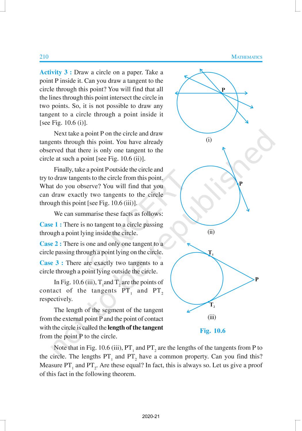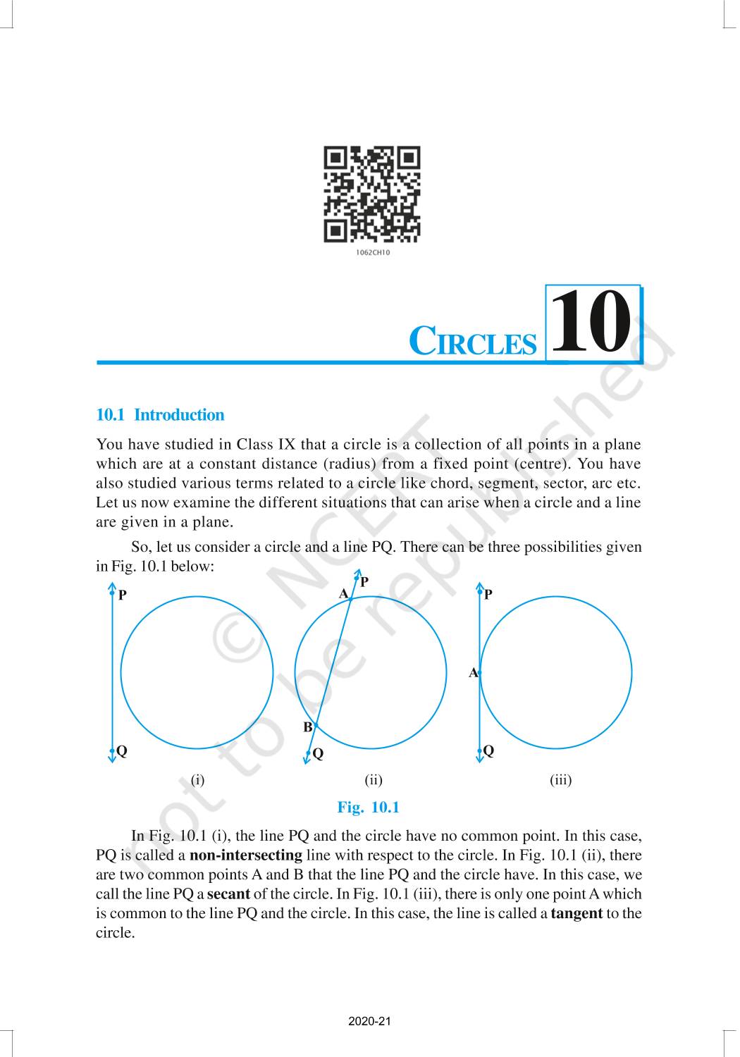 You have studied in Class IX that a circle is a collection of all points in a plane which are at a constant distance (radius) from a fixed point (centre). You have also studied various terms related to a circle like chord, segment, sector, arc etc. You will also learn some other important terms like Tangent to a Circle, Number of Tangents from a Point on a Circle, different theorems with proof.