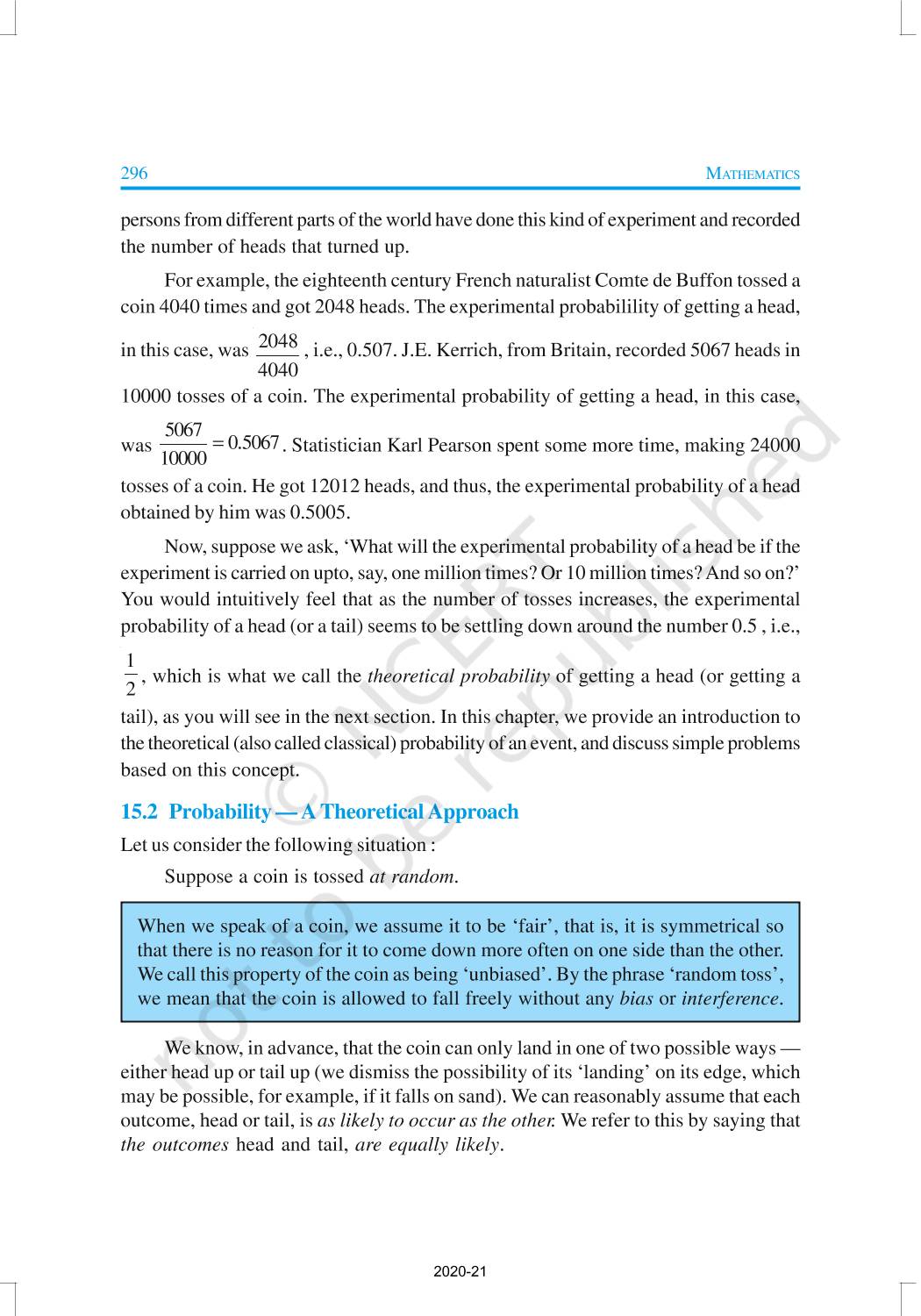 You have studied about experimental (or empirical) probabilities of events which were based on the results of actual experiments. We discussed an experiment of tossing a coin 1000 times in which the frequencies of the outcomes were as follows: