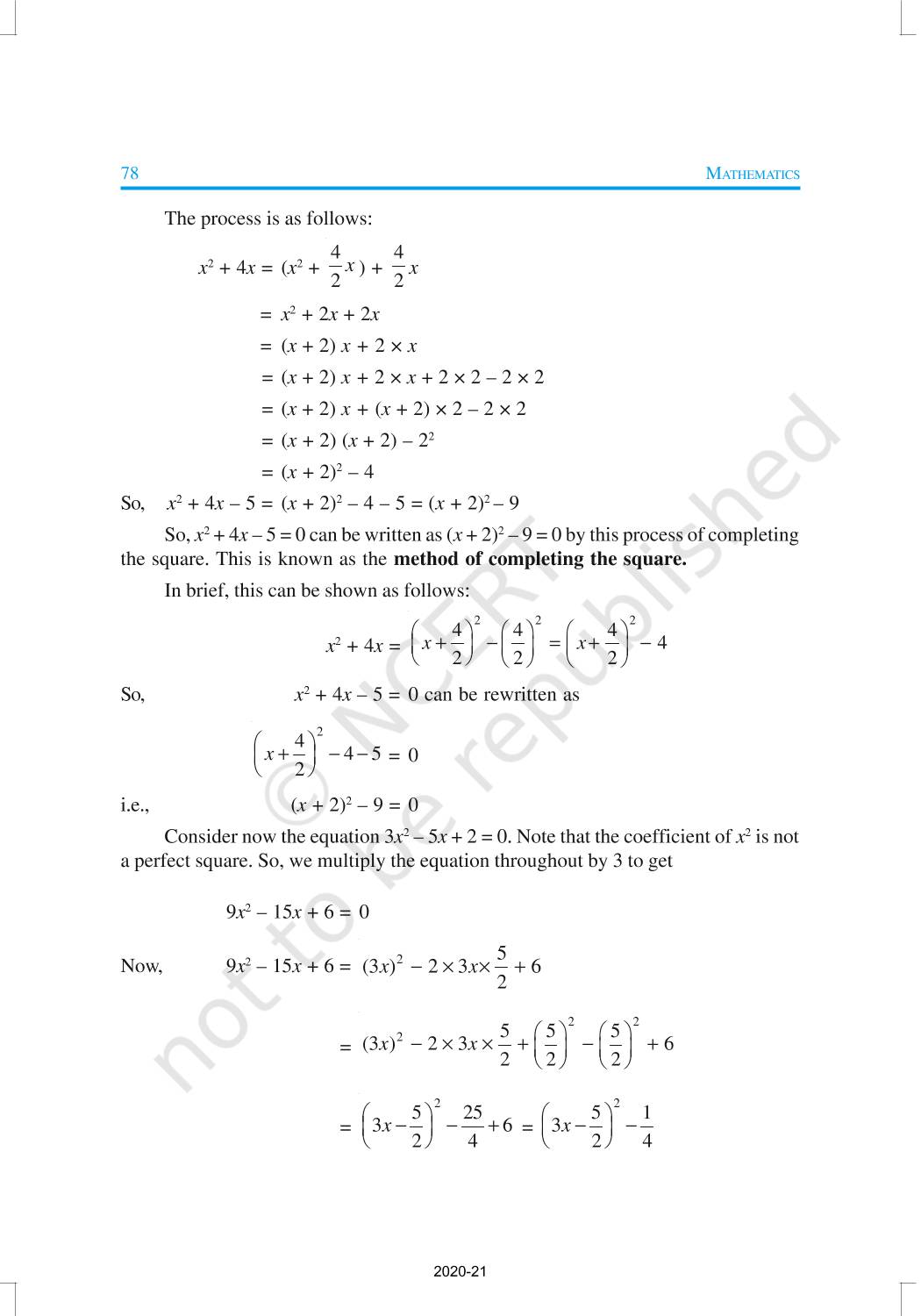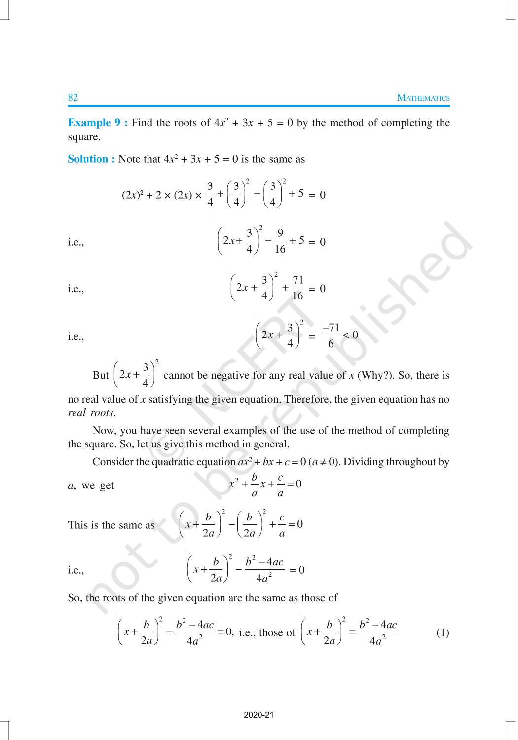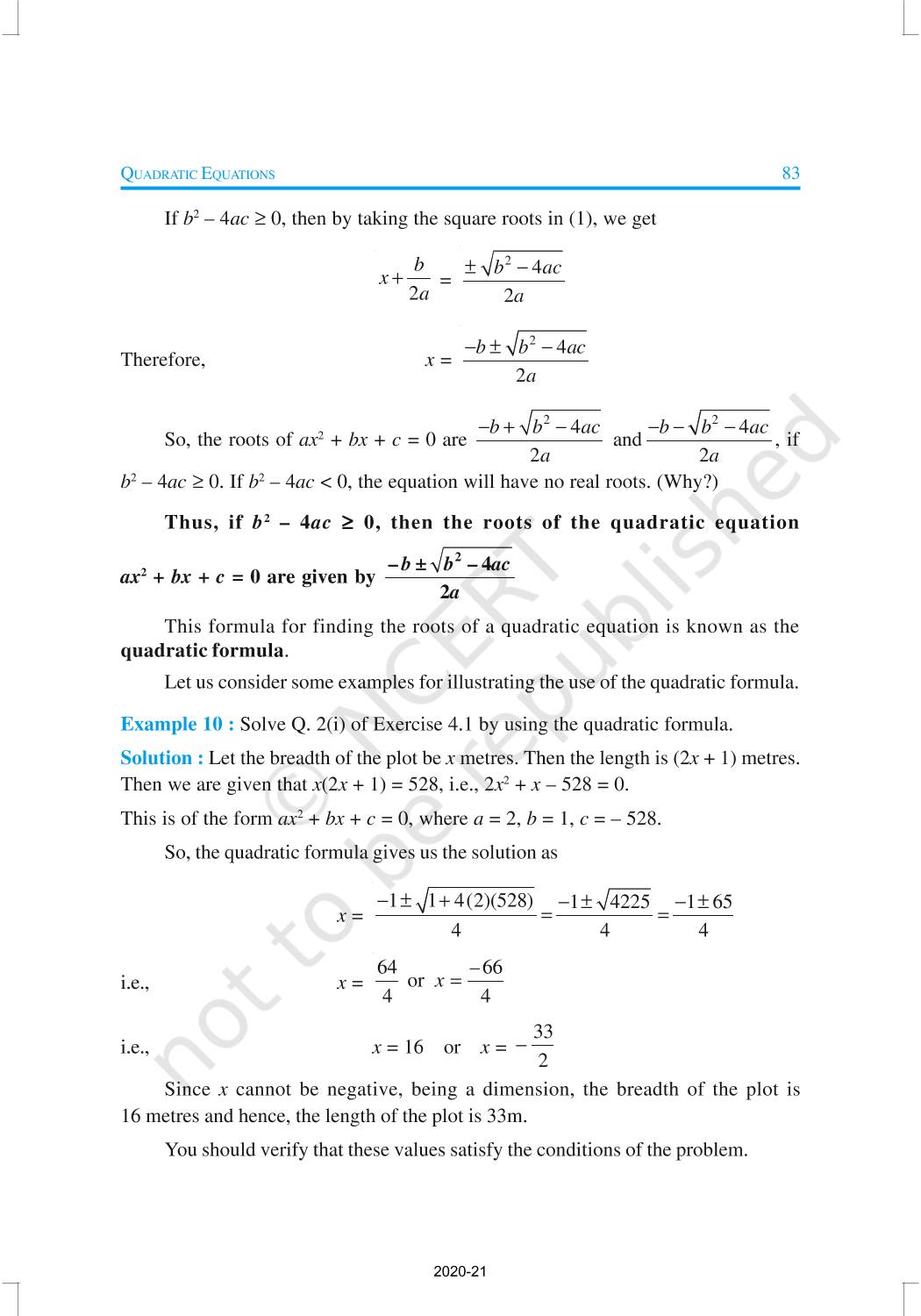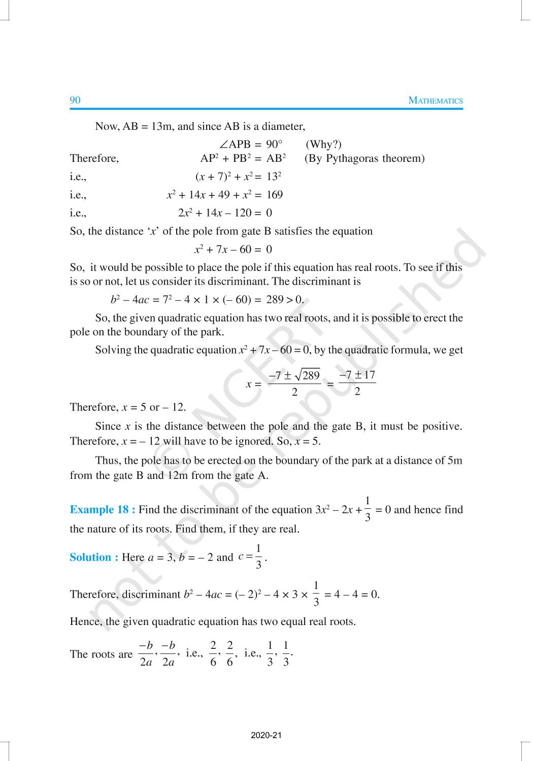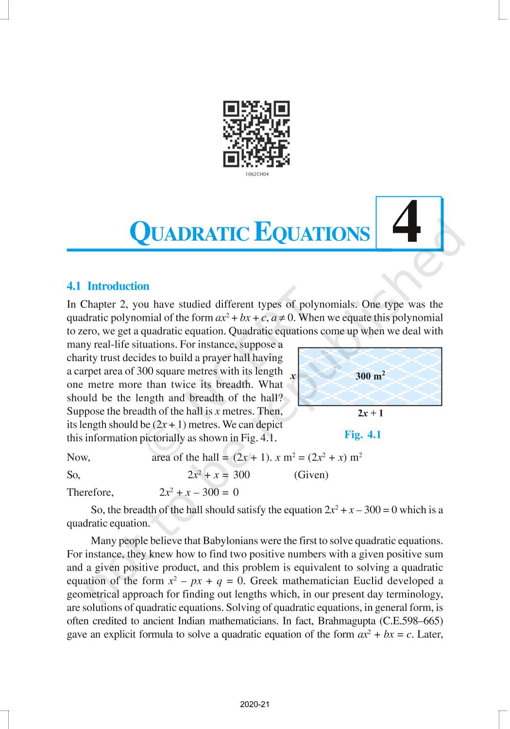 In this chapter, you will study quadratic equations, and various ways of finding their roots. You will also see some applications of quadratic equations in daily life situations. A quadratic equation in the variable x is an equation of the form ax2 + bx + c = 0, where a, b, c are real numbers, a ≠ 0. For example, 2x2 + x – 300 = 0 is a quadratic equation.