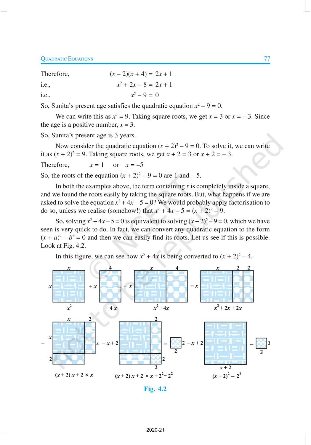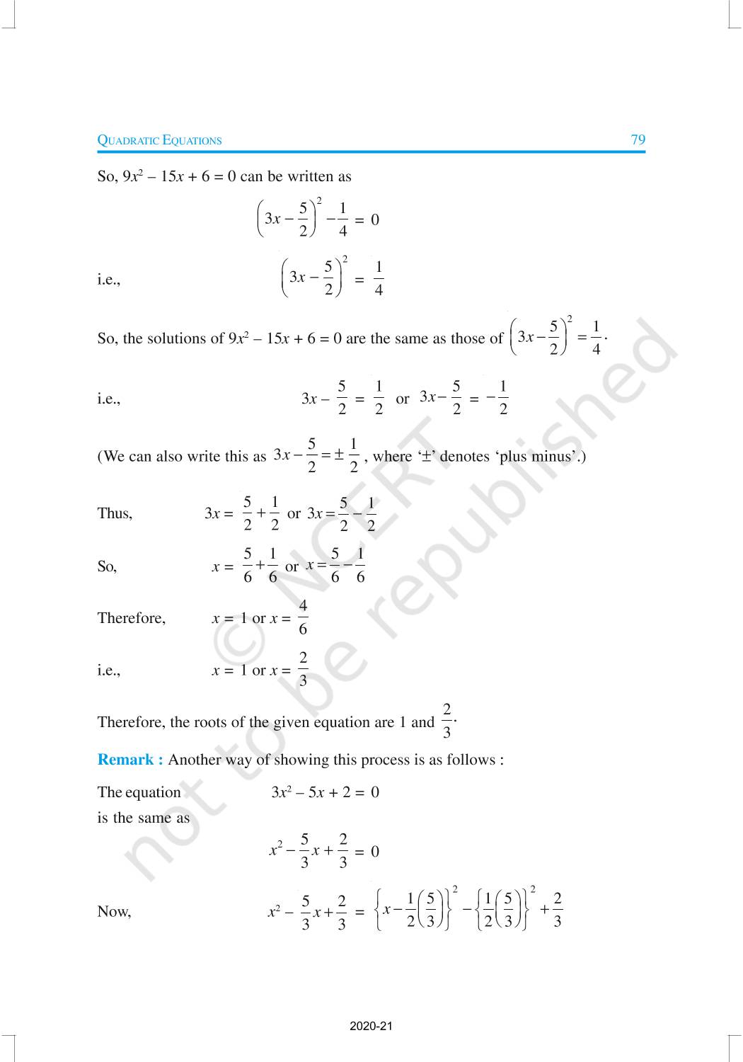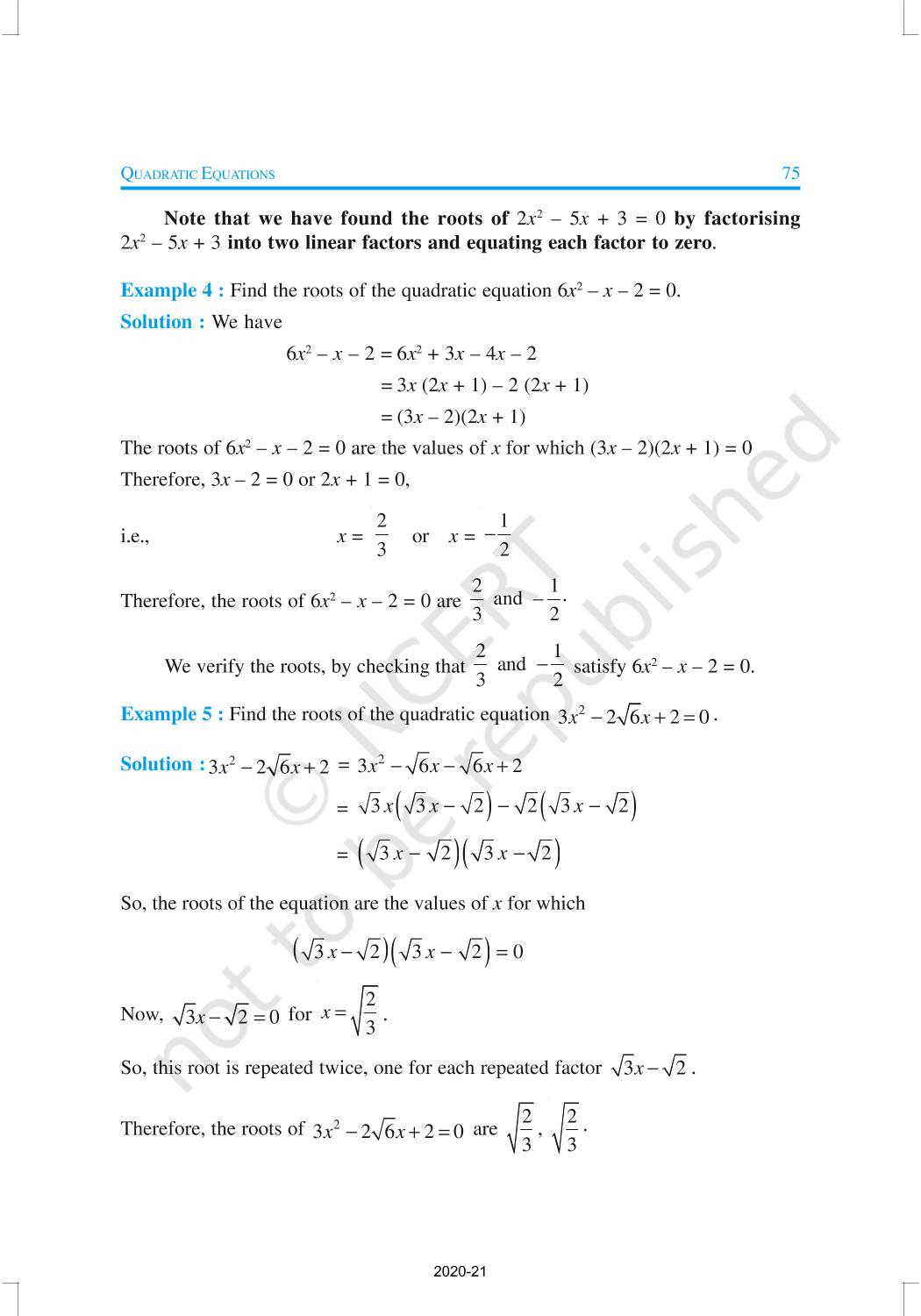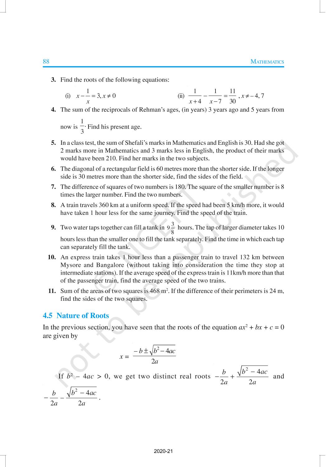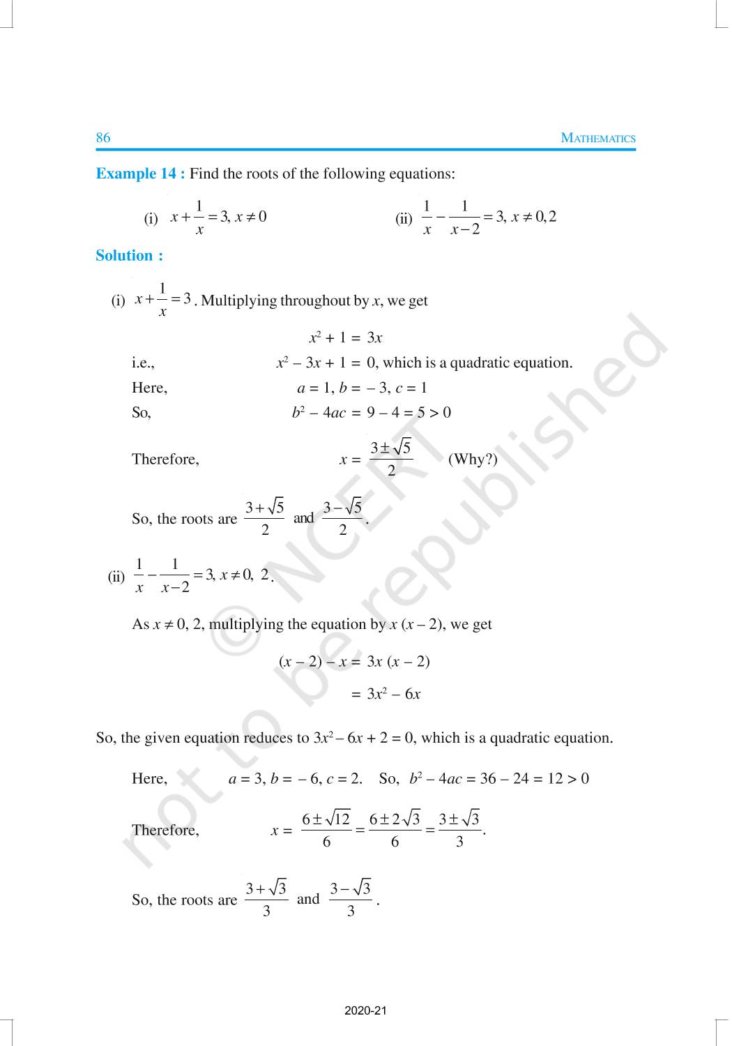 In this chapter, you will study quadratic equations, and various ways of finding their roots. You will also see some applications of quadratic equations in daily life situations. A quadratic equation in the variable x is an equation of the form ax2 + bx + c = 0, where a, b, c are real numbers, a ≠ 0. For example, 2x2 + x – 300 = 0 is a quadratic equation.