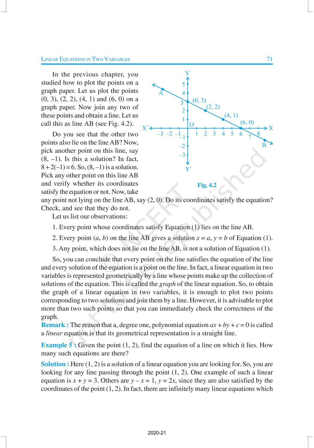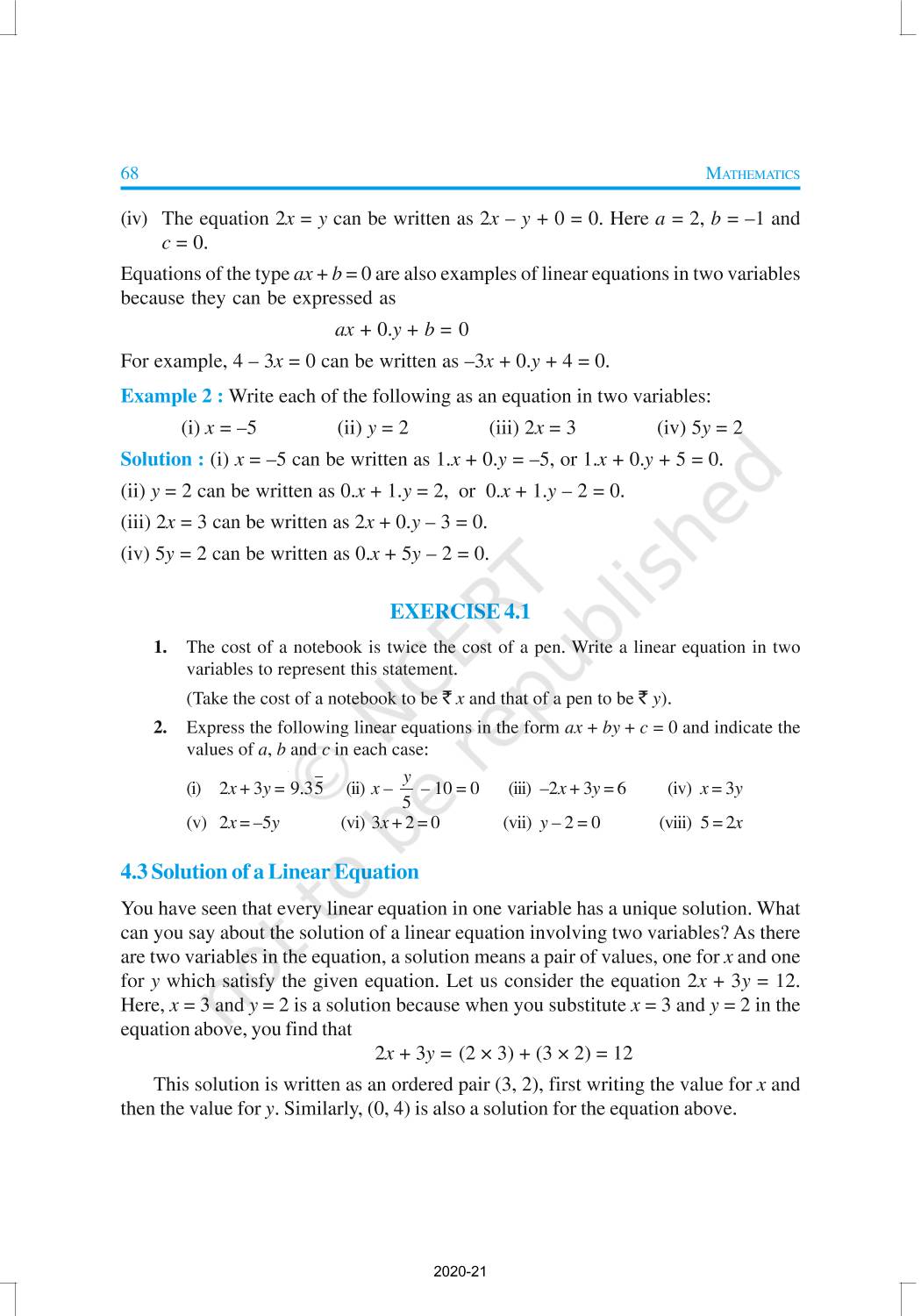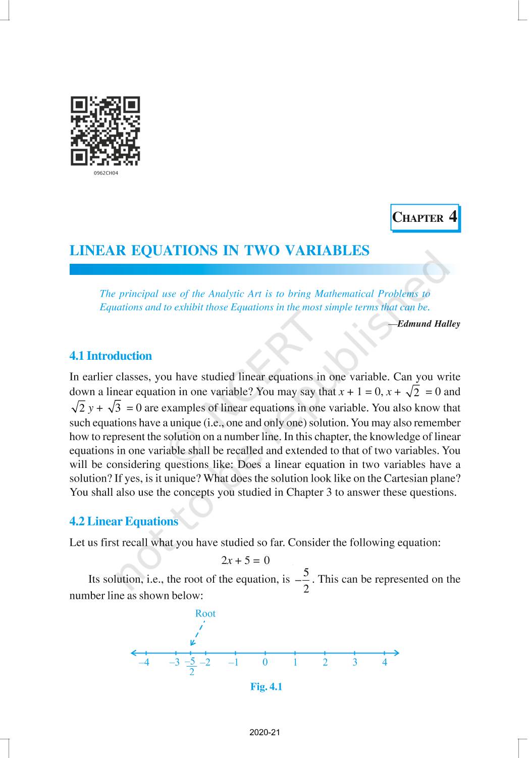 In earlier classes, you have studied linear equations in one variable.You know that Linear equations have a unique (i.e., one and only one) solution. You may also remember how to represent the solution on a number line. In this chapter, the knowledge of linear equations in one variable shall be recalled and extended to that of two variables. You will be considering questions like: Does a linear equation in two variables have a solution? If yes, is it unique? What does the solution look like on the Cartesian plane? You shall also use the concepts you studied in Chapter 3 to answer these questions.