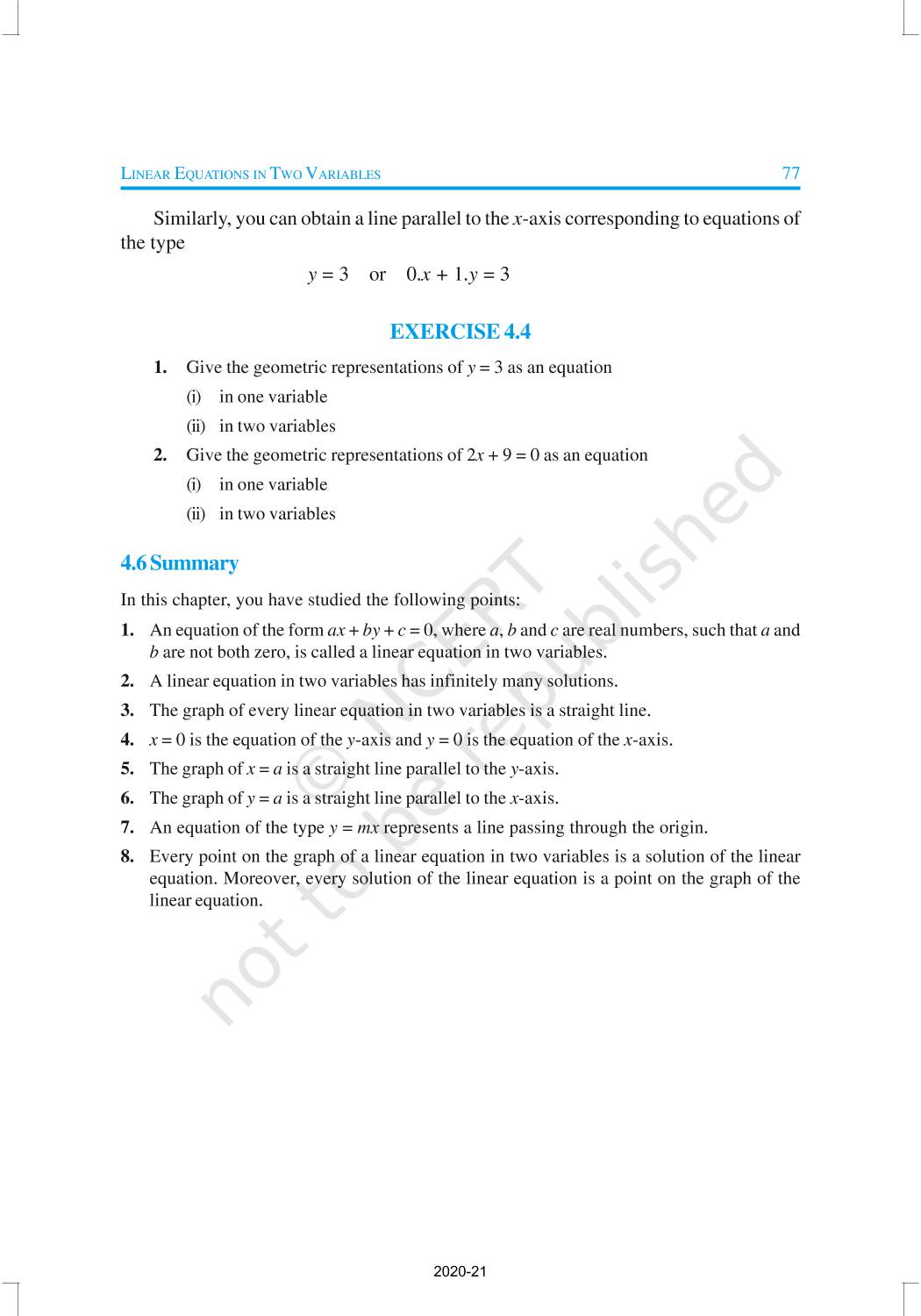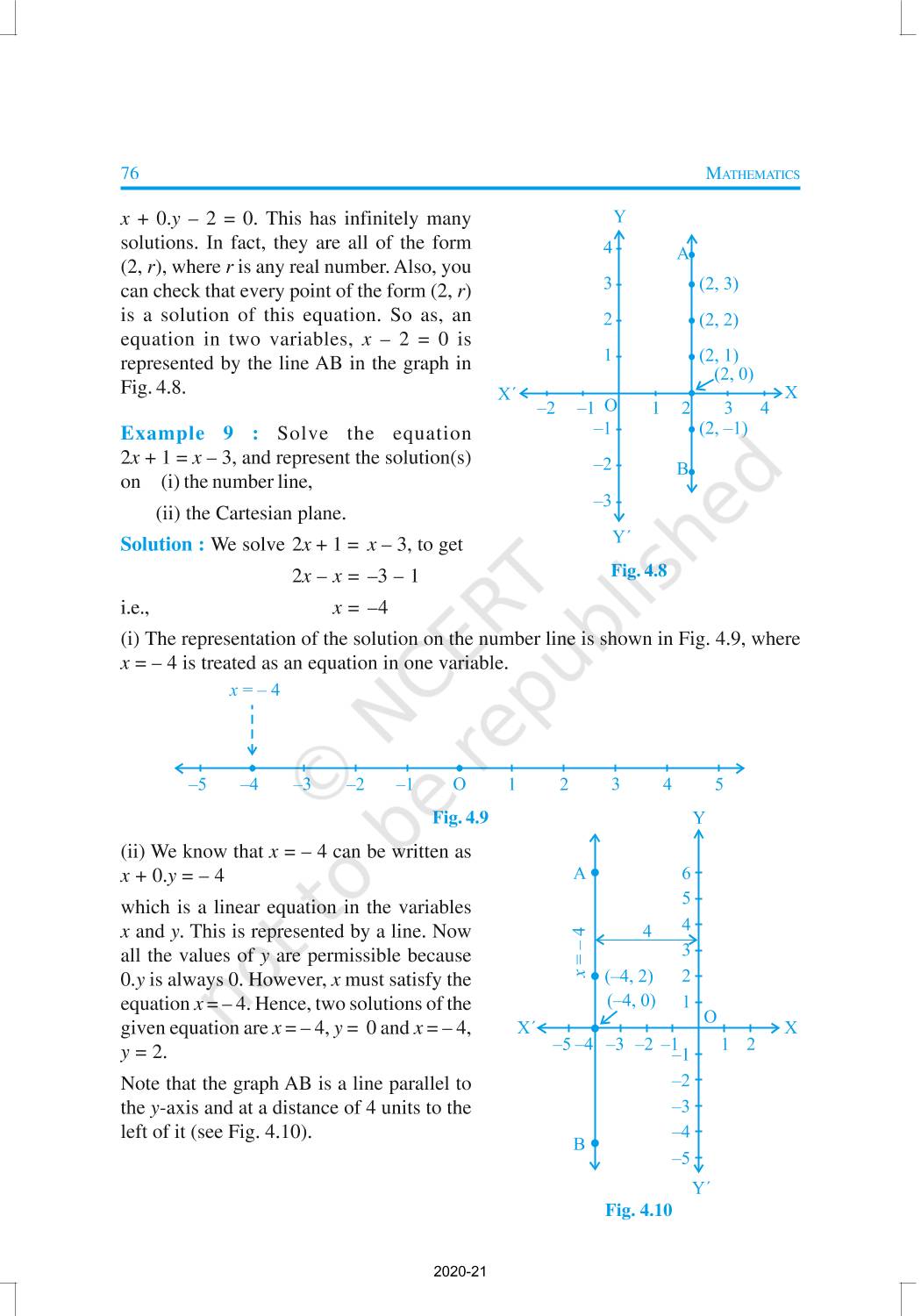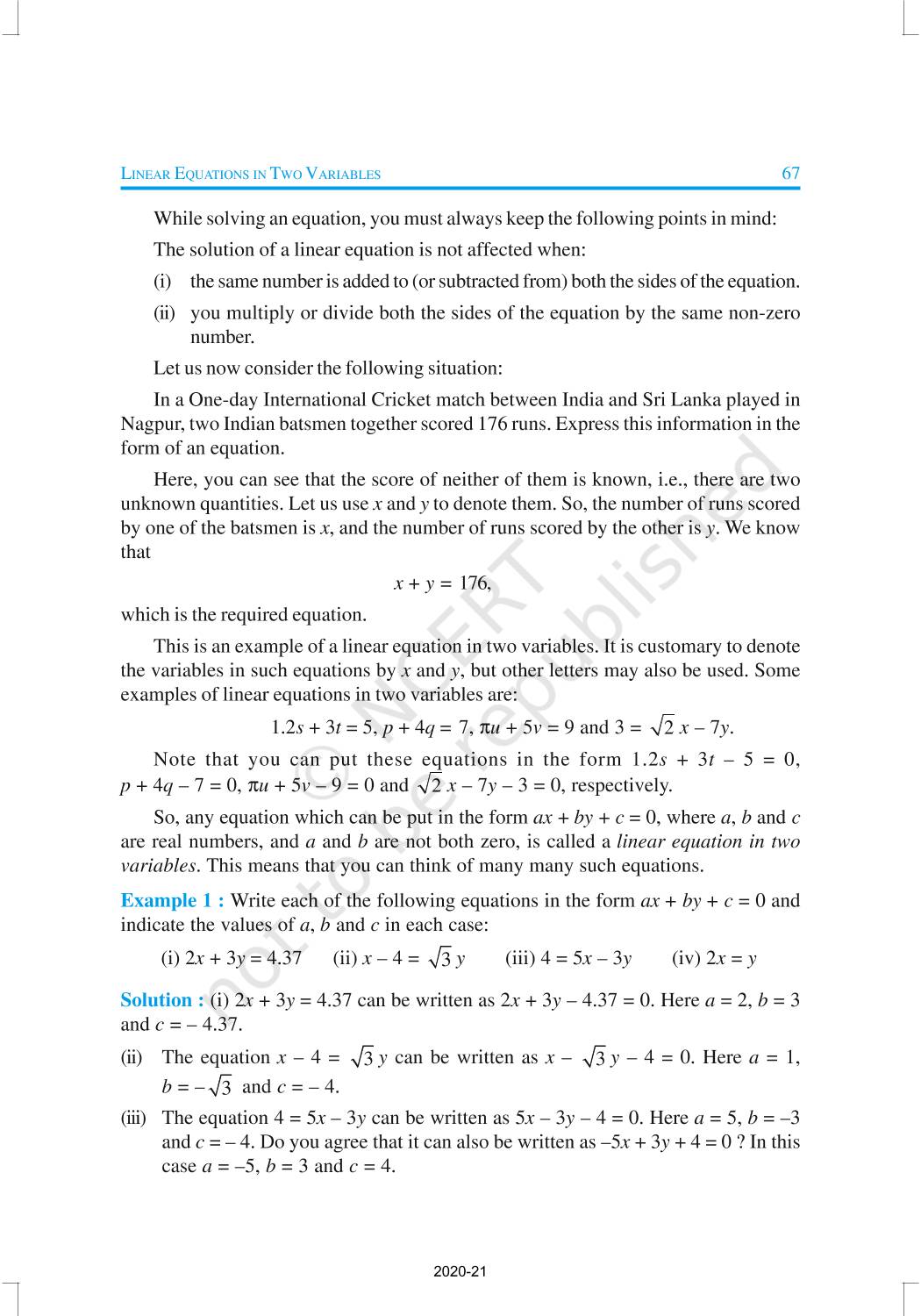In earlier classes, you have studied linear equations in one variable.You know that Linear equations have a unique (i.e., one and only one) solution. You may also remember how to represent the solution on a number line. In this chapter, the knowledge of linear equations in one variable shall be recalled and extended to that of two variables. You will be considering questions like: Does a linear equation in two variables have a solution? If yes, is it unique? What does the solution look like on the Cartesian plane? You shall also use the concepts you studied in Chapter 3 to answer these questions.