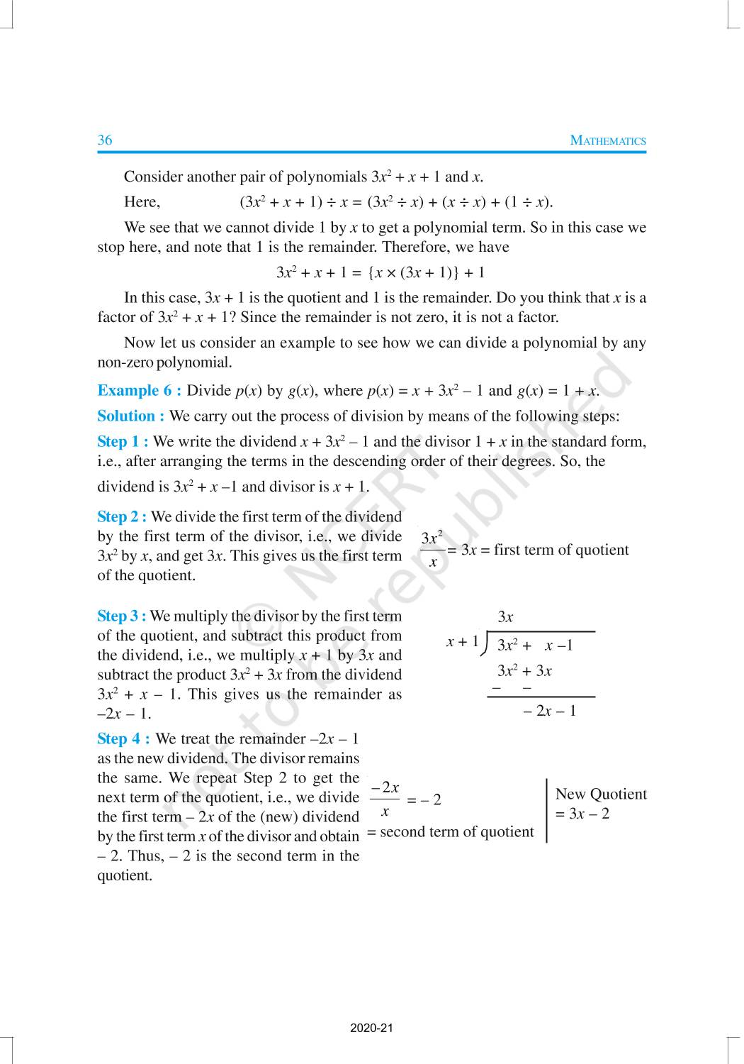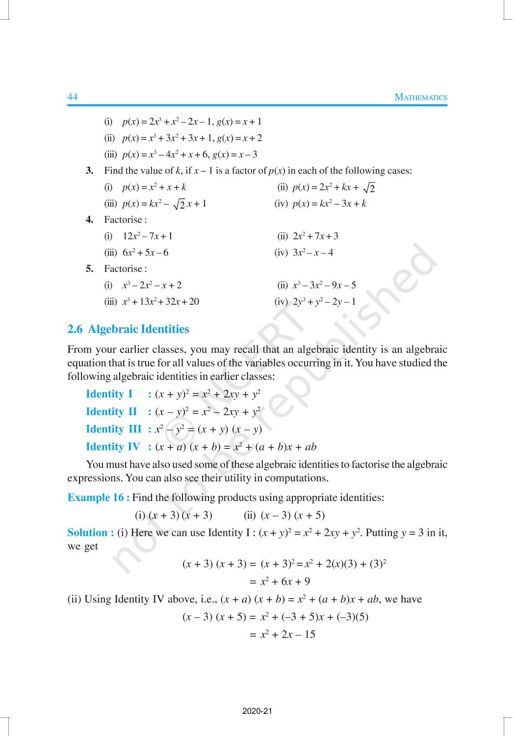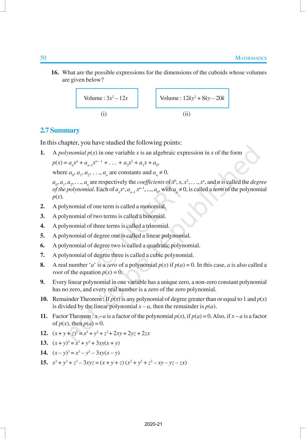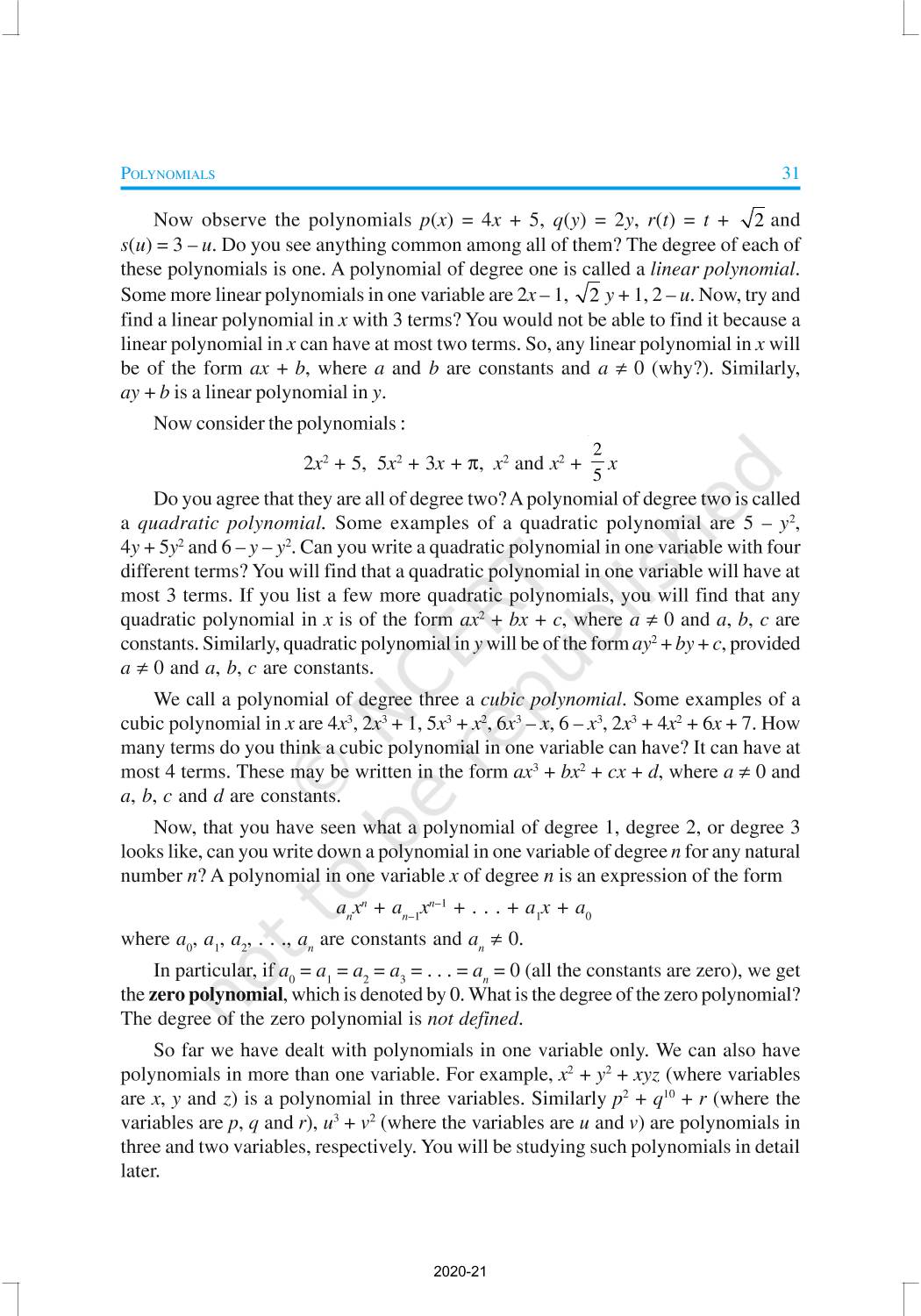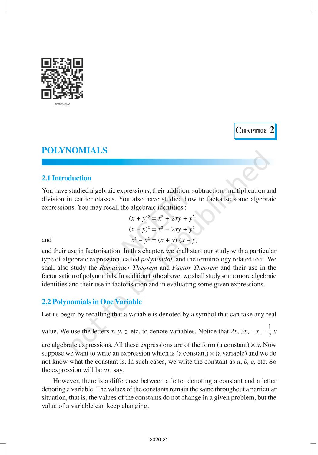 You have studied algebraic expressions, their addition, subtraction, multiplication and division in earlier classes. You also have studied how to factorise some algebraic expressions.In this chapter, we shall start our study with a particular type of algebraic expression, called polynomial, and the terminology related to it. We shall also study the Remainder Theorem and the Factor Theorem and their use in the factorisation of polynomials. In addition to the above, we shall study some more algebraic identities and their use in factorisation and in evaluating some given expressions, finding Zeroes of a Polynomial.