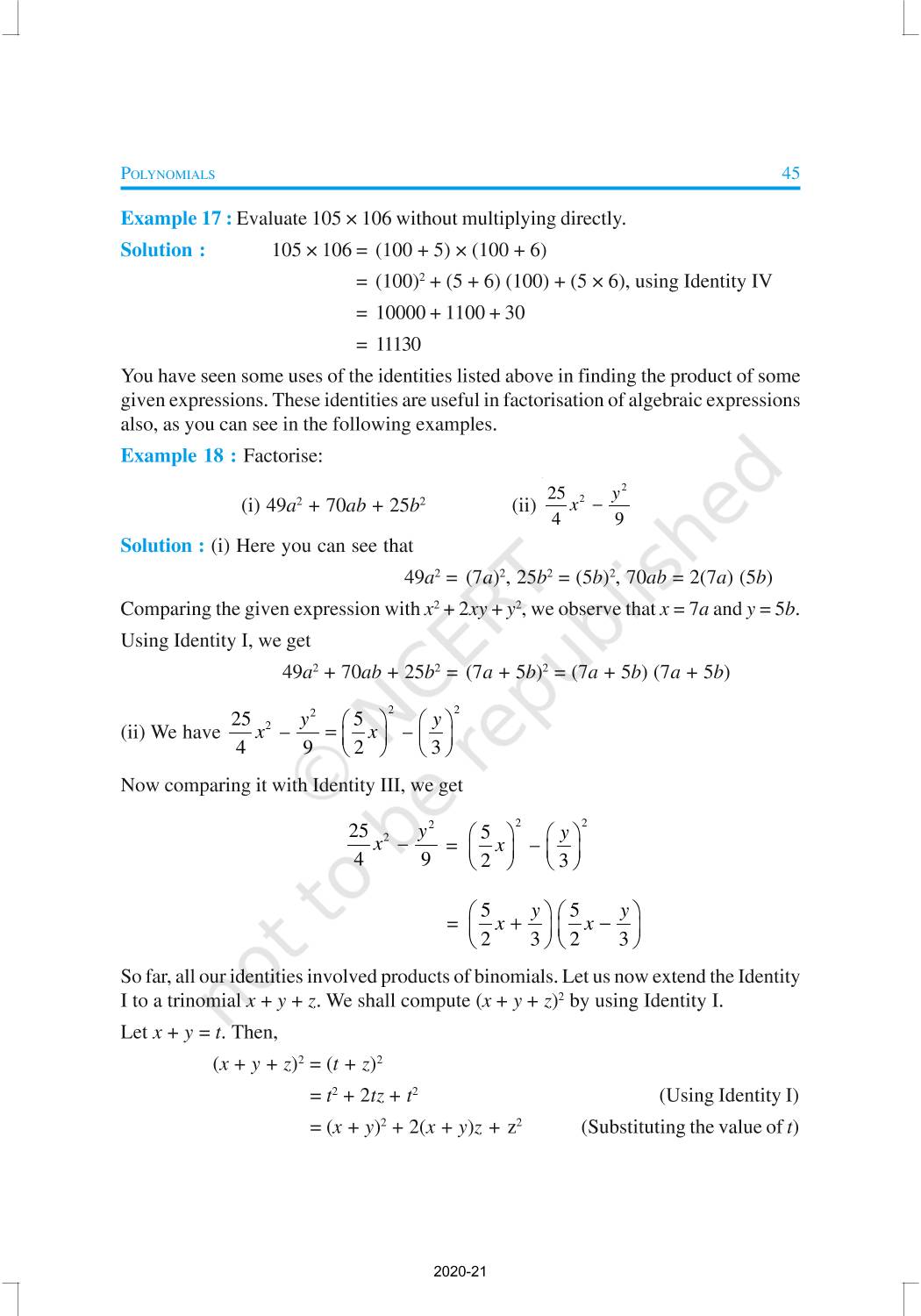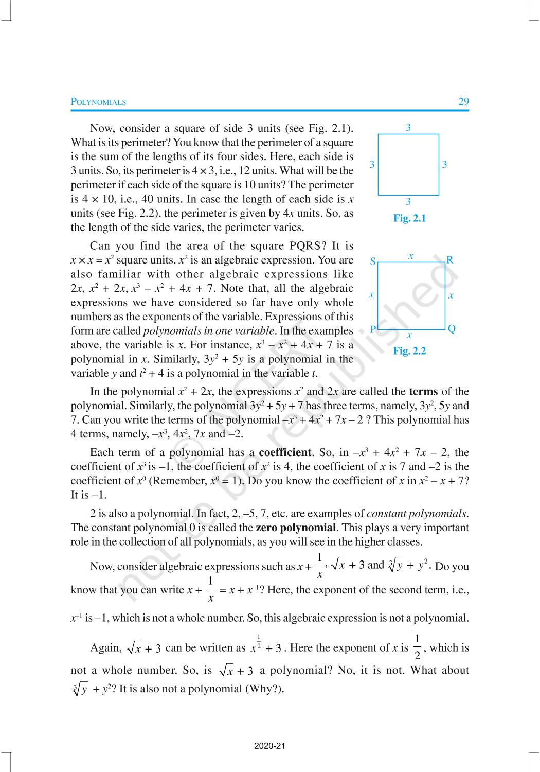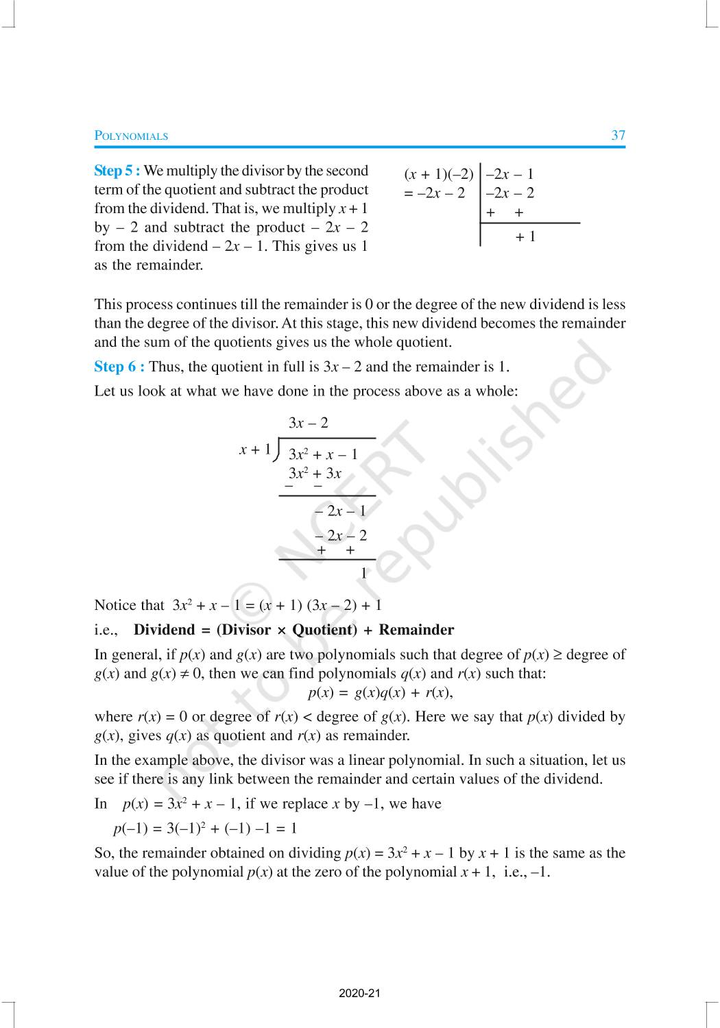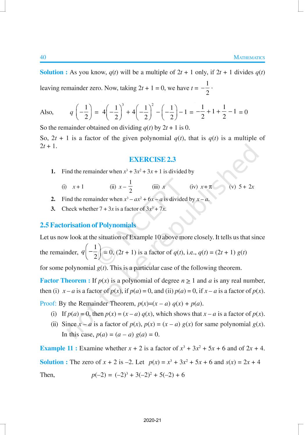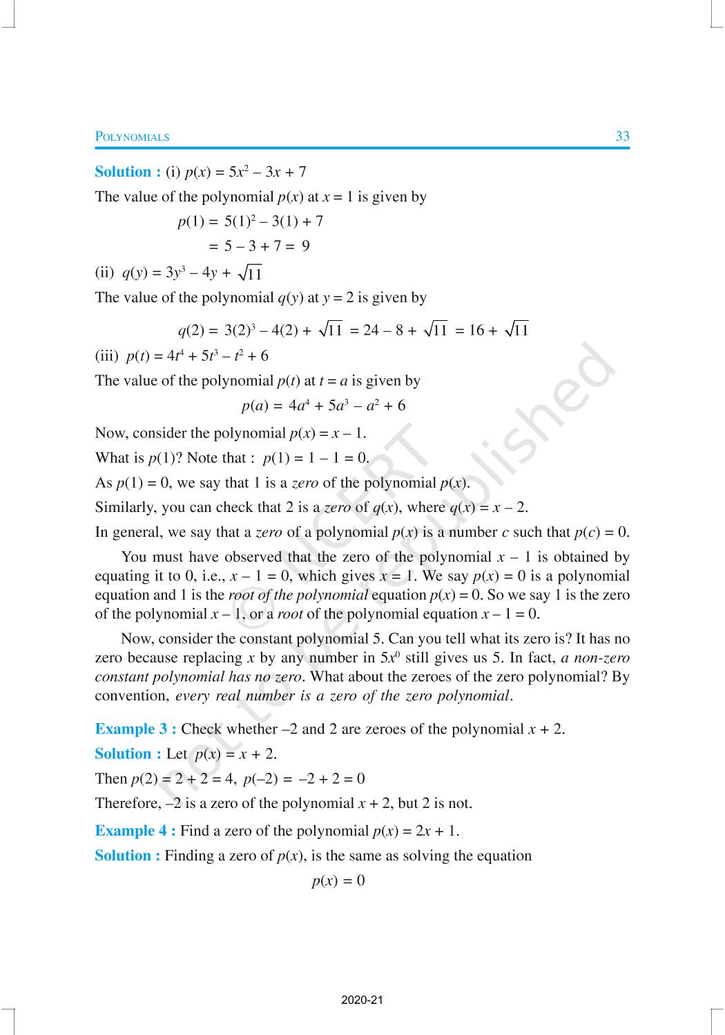 You have studied algebraic expressions, their addition, subtraction, multiplication and division in earlier classes. You also have studied how to factorise some algebraic expressions.In this chapter, we shall start our study with a particular type of algebraic expression, called polynomial, and the terminology related to it. We shall also study the Remainder Theorem and the Factor Theorem and their use in the factorisation of polynomials. In addition to the above, we shall study some more algebraic identities and their use in factorisation and in evaluating some given expressions, finding Zeroes of a Polynomial.