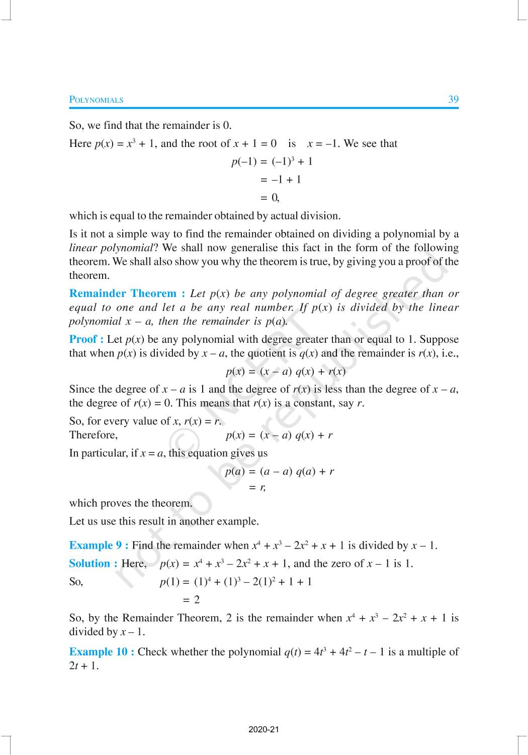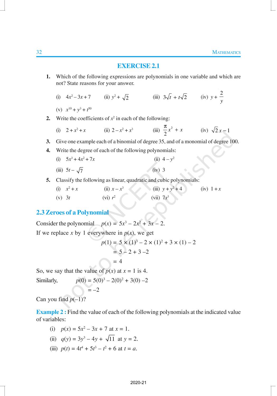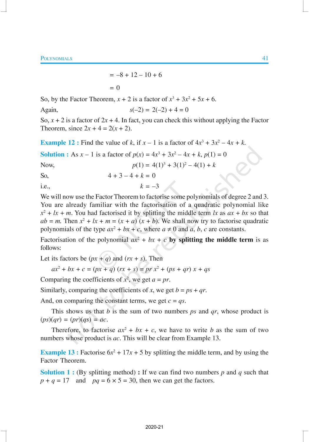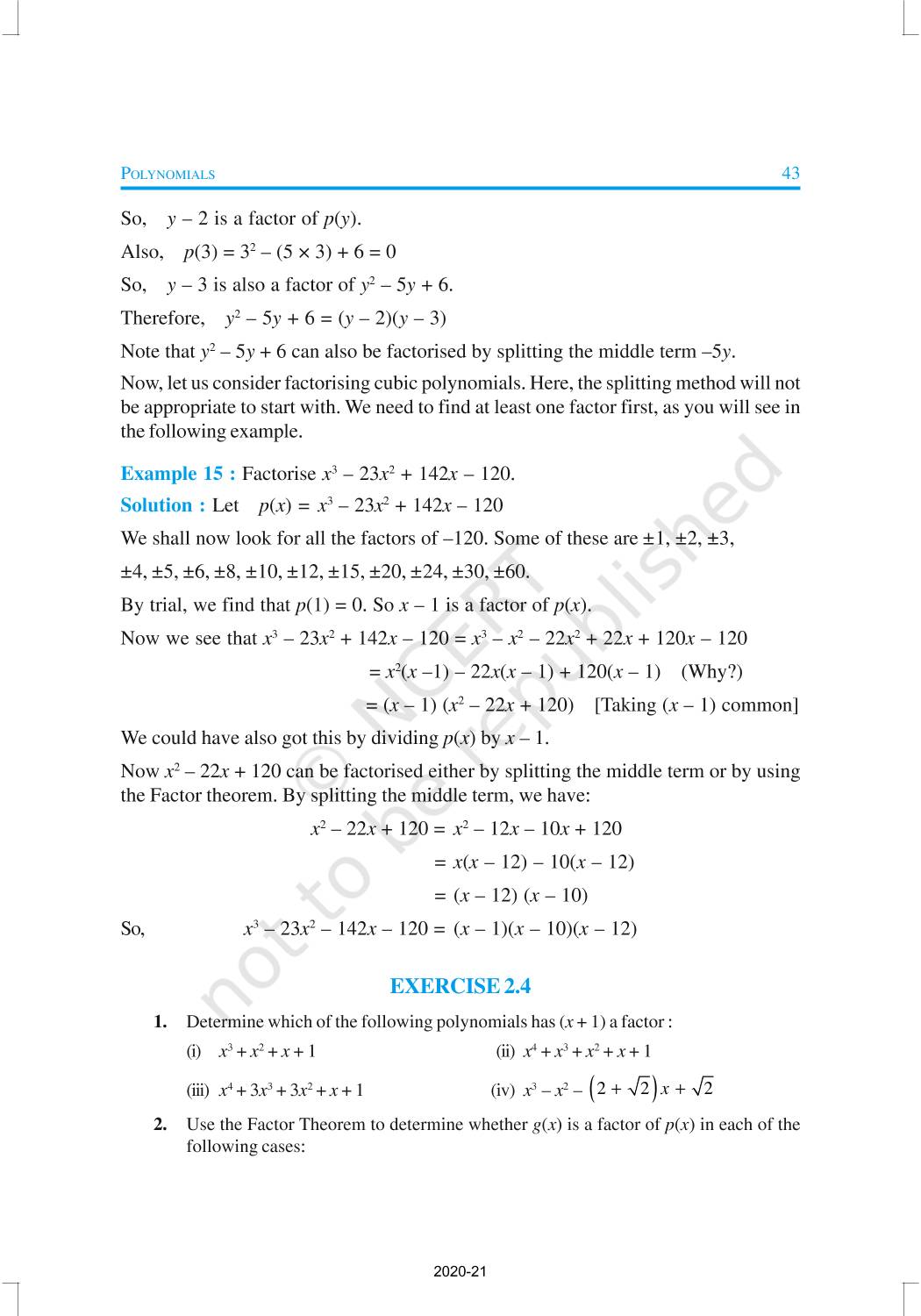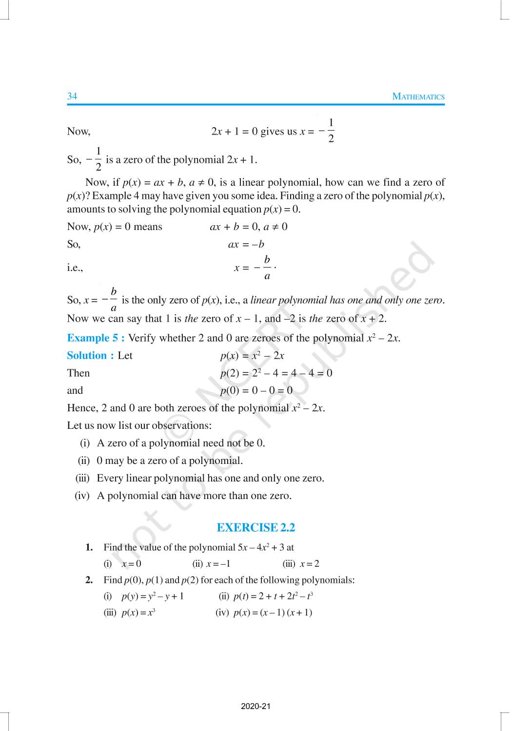 You have studied algebraic expressions, their addition, subtraction, multiplication and division in earlier classes. You also have studied how to factorise some algebraic expressions.In this chapter, we shall start our study with a particular type of algebraic expression, called polynomial, and the terminology related to it. We shall also study the Remainder Theorem and the Factor Theorem and their use in the factorisation of polynomials. In addition to the above, we shall study some more algebraic identities and their use in factorisation and in evaluating some given expressions, finding Zeroes of a Polynomial.