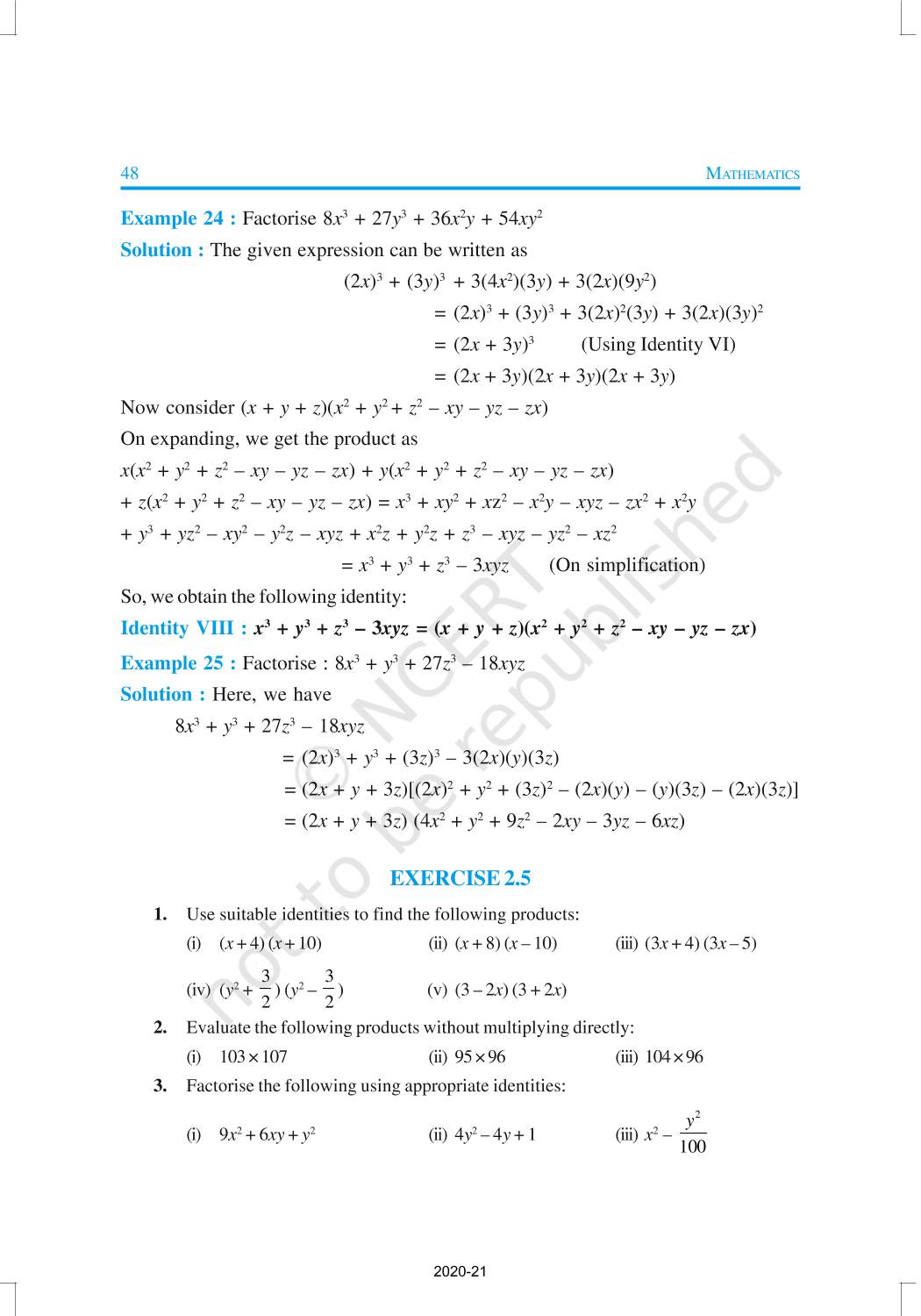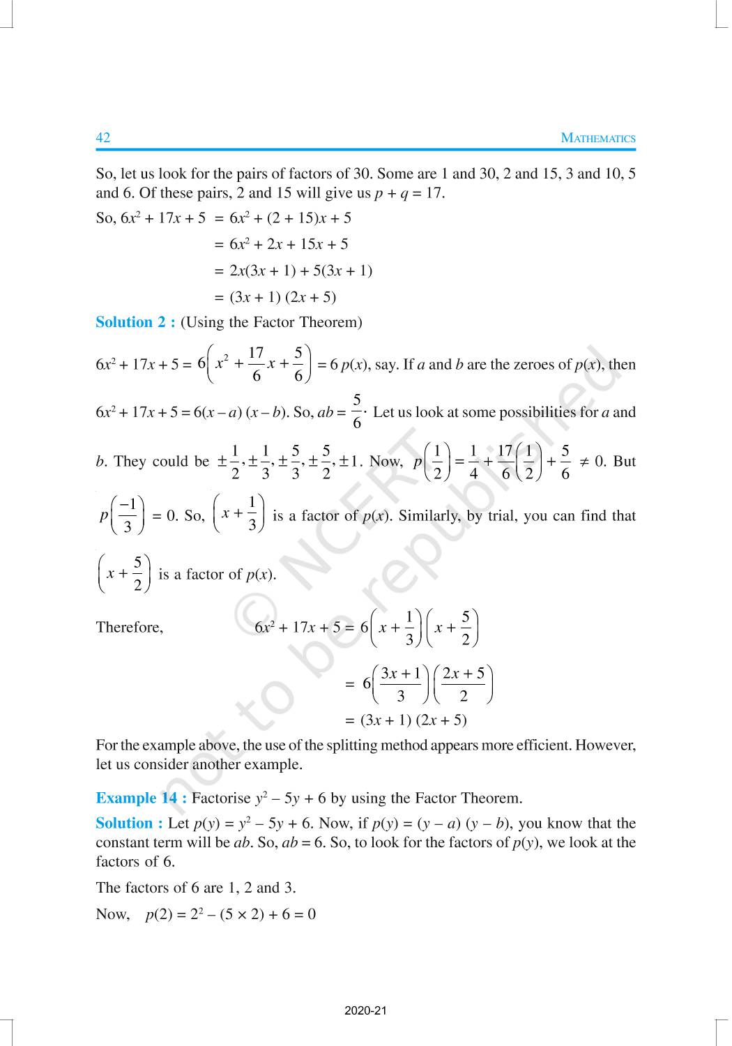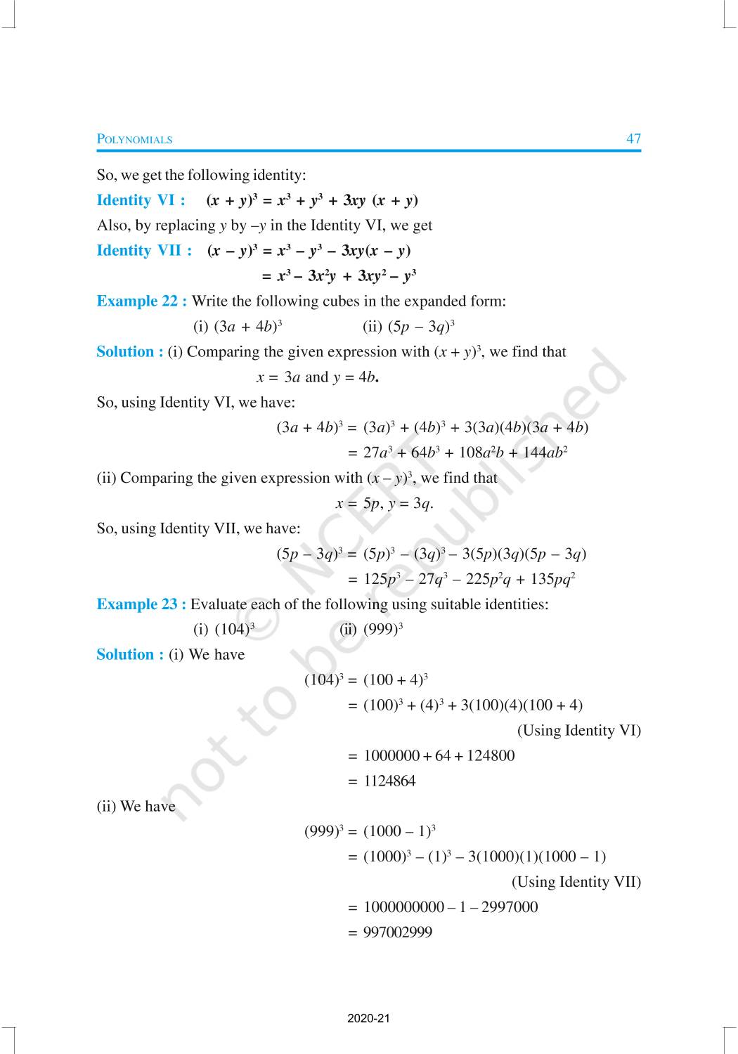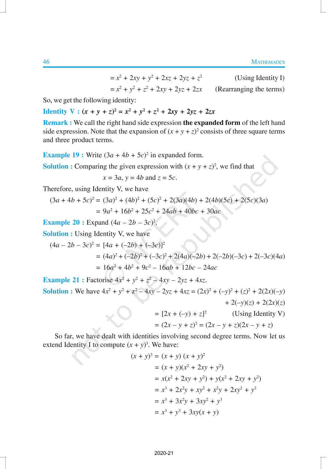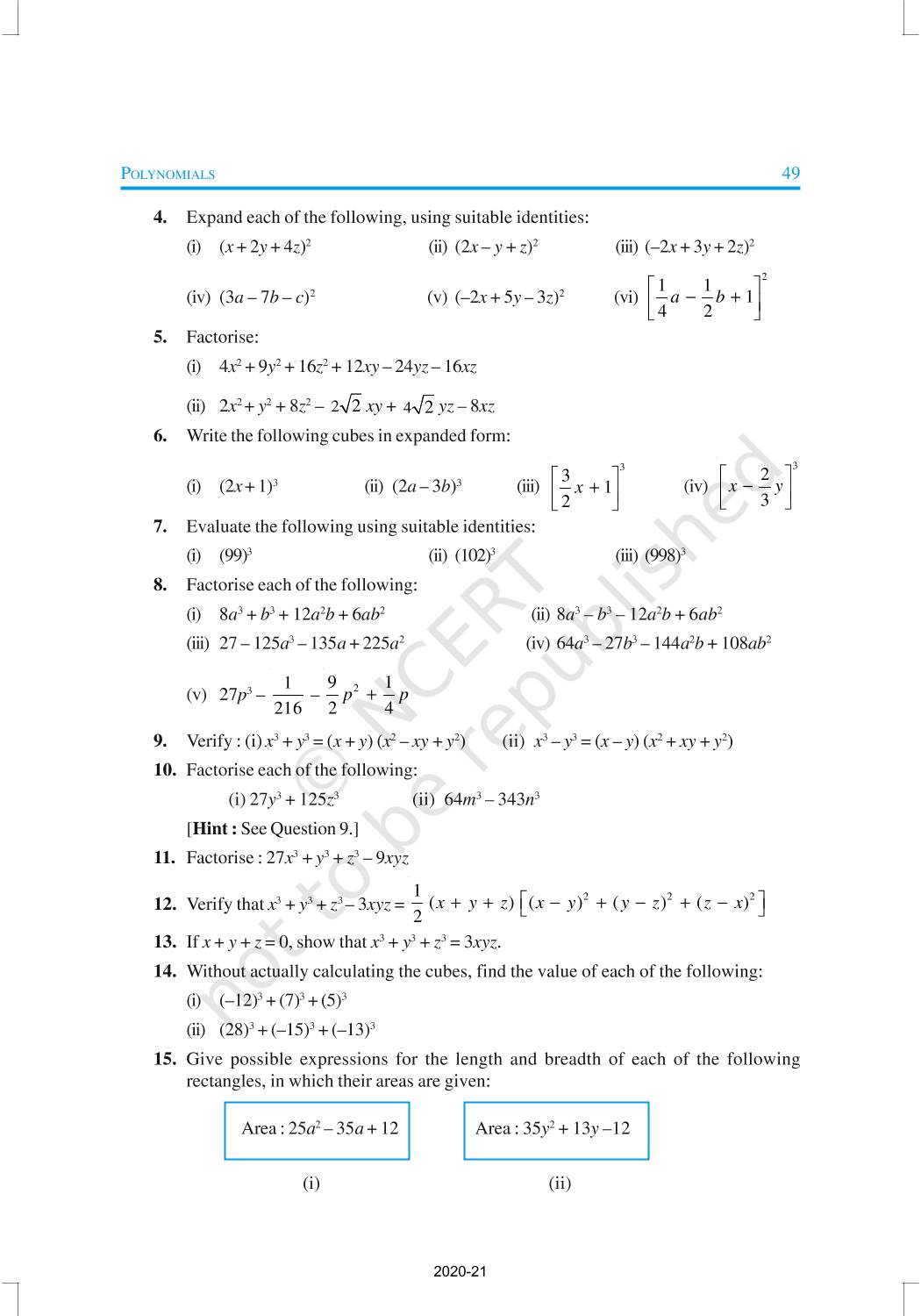 You have studied algebraic expressions, their addition, subtraction, multiplication and division in earlier classes. You also have studied how to factorise some algebraic expressions.In this chapter, we shall start our study with a particular type of algebraic expression, called polynomial, and the terminology related to it. We shall also study the Remainder Theorem and the Factor Theorem and their use in the factorisation of polynomials. In addition to the above, we shall study some more algebraic identities and their use in factorisation and in evaluating some given expressions, finding Zeroes of a Polynomial.