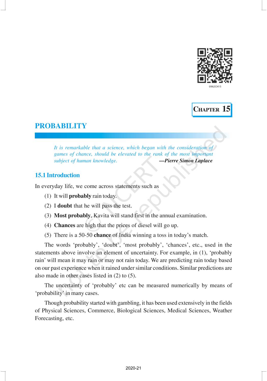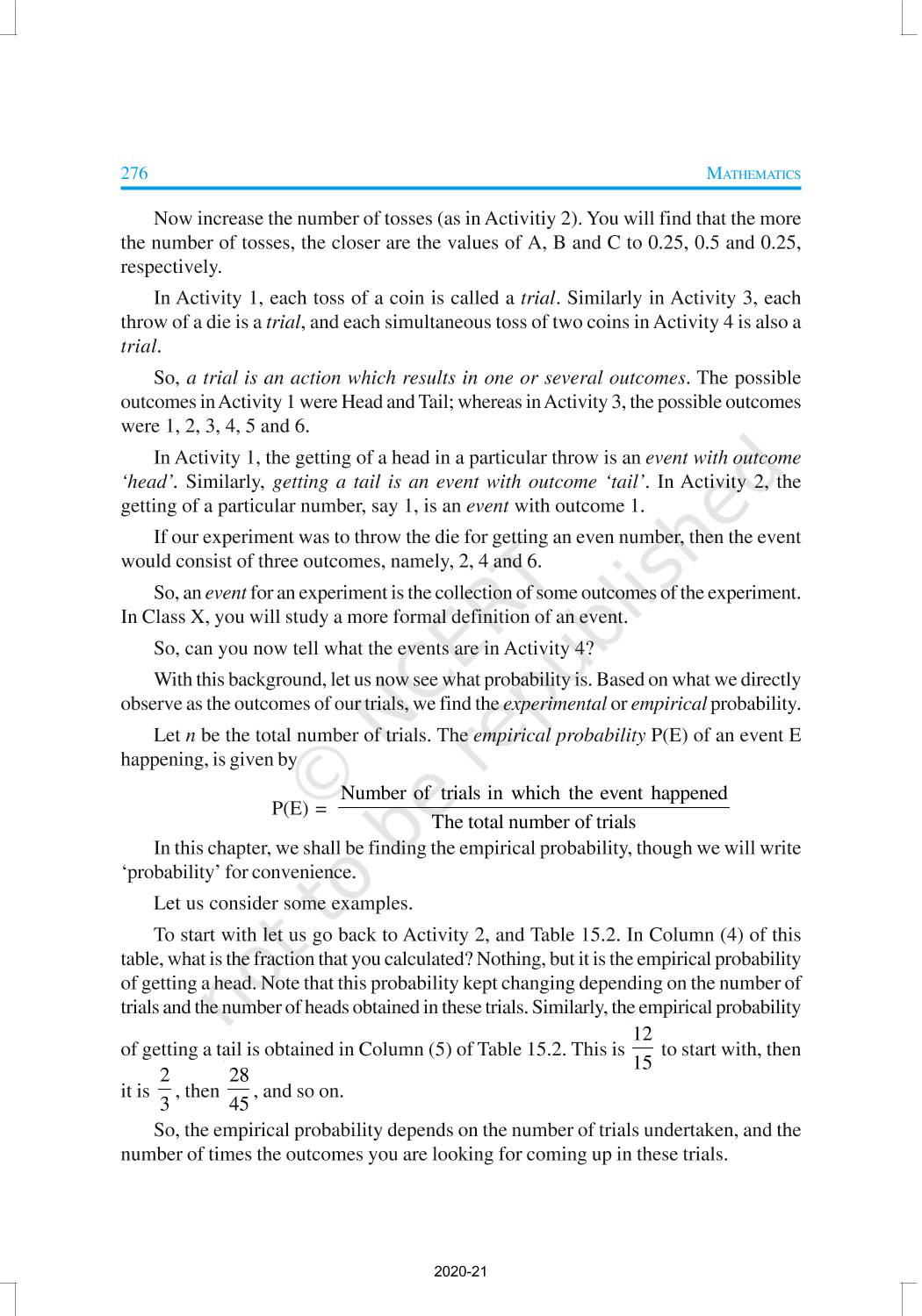 In earlier classes, you have had a glimpse of probability when you performed experiments like tossing of coins, throwing of dice, etc., and observed their outcomes. You will now learn to measure the chance of occurrence of a particular outcome in an experiment.