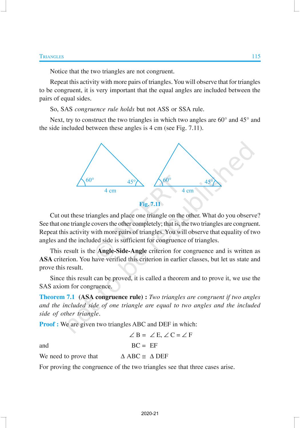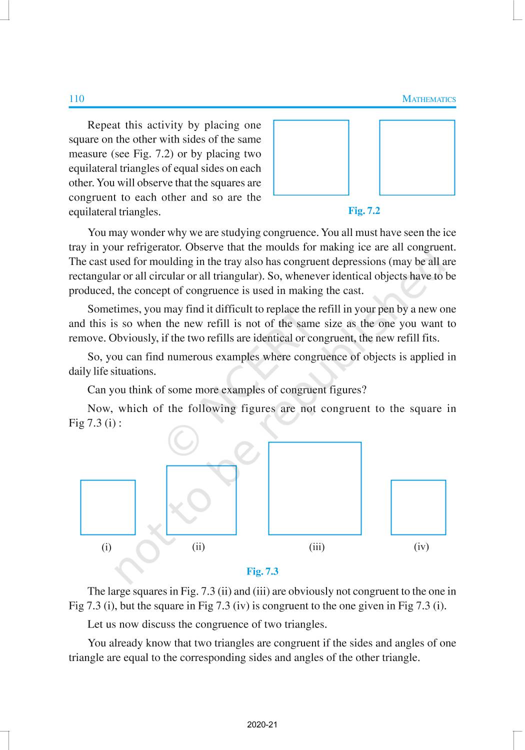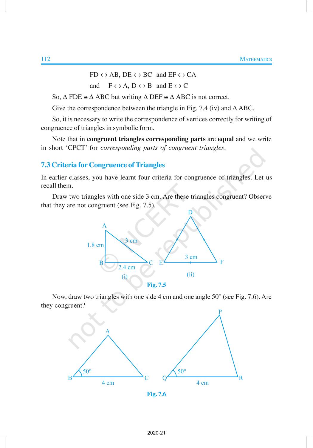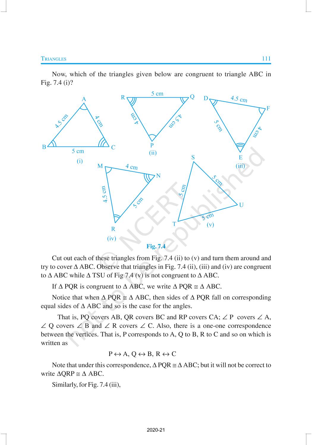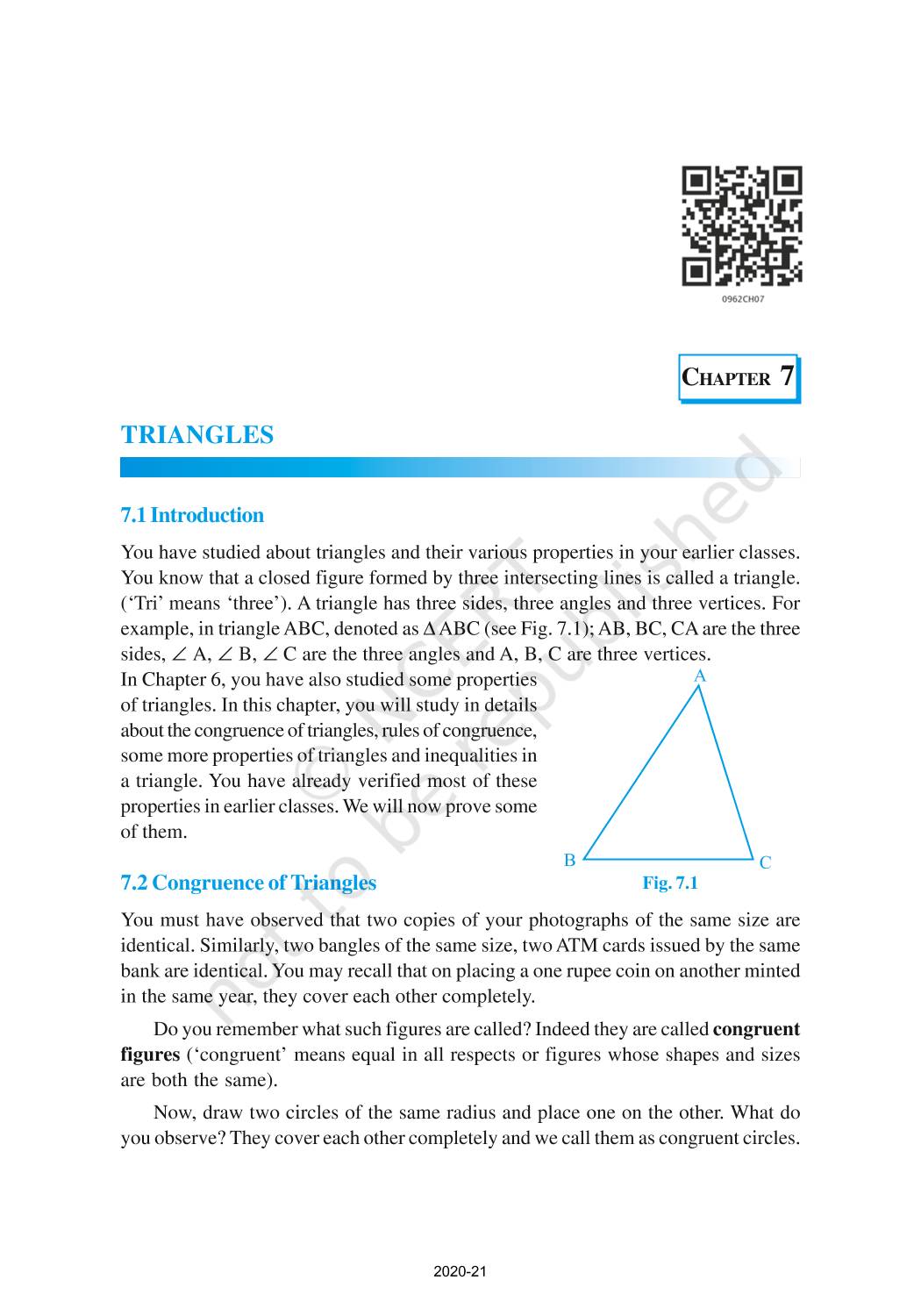 You have studied about triangles and their various properties in your earlier classes. You know that a closed figure formed by three intersecting lines is called a triangle. (‘Tri’ means ‘three’). A triangle has three sides, three angles and three vertices. In Chapter 6, you have also studied some properties of triangles. In this chapter, you will study in details about the congruence of triangles, rules of congruence, some more properties of triangles and inequalities in a triangle. You have already verified most of these properties in earlier classes. We will now prove some of them.
