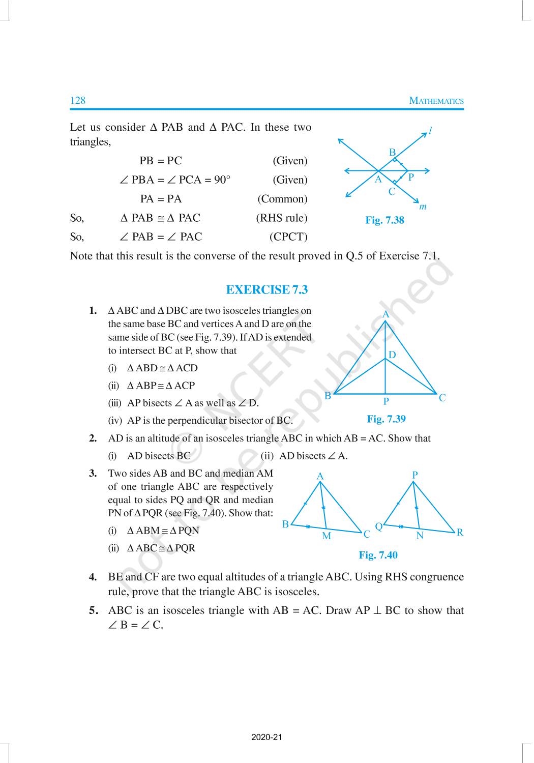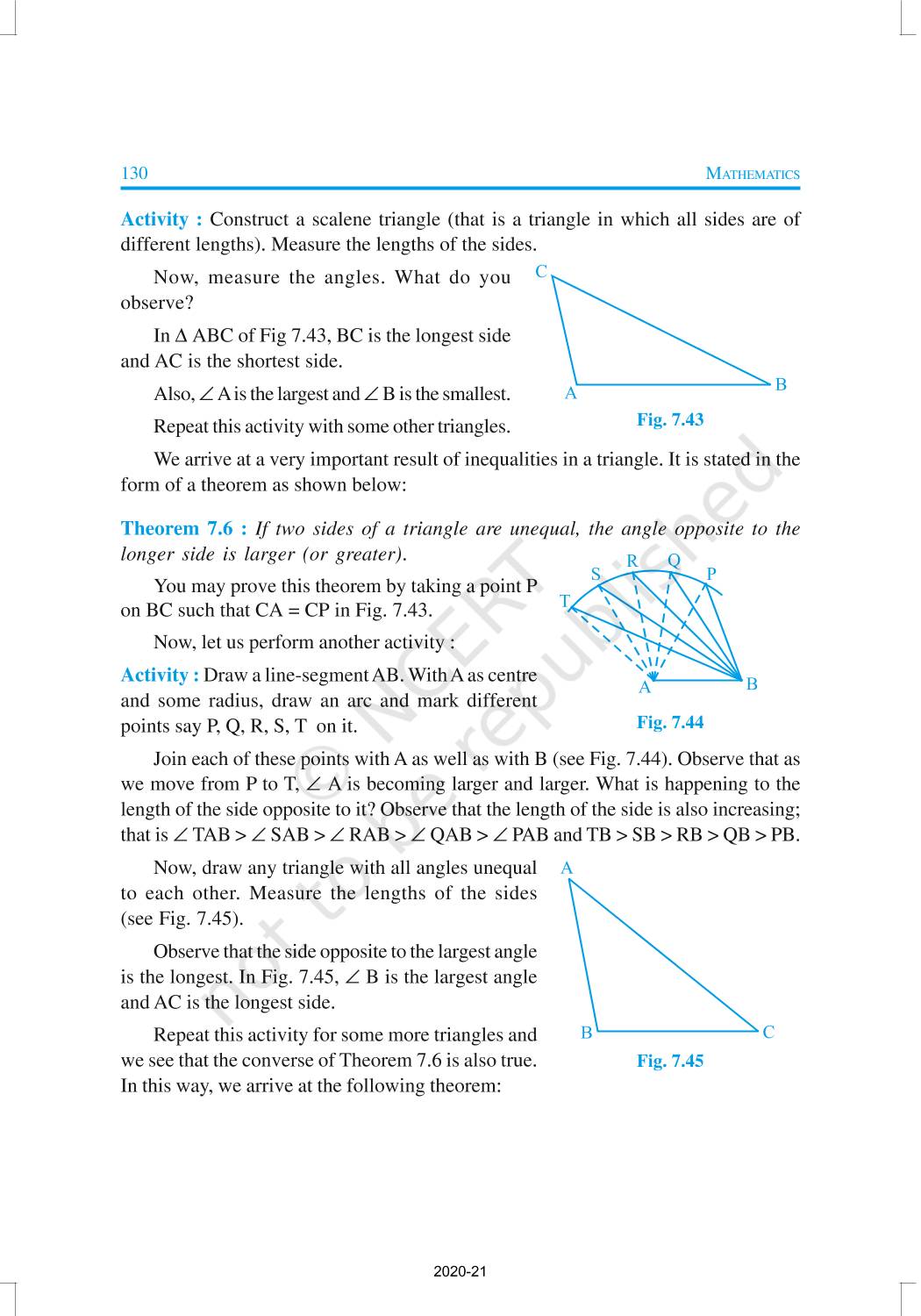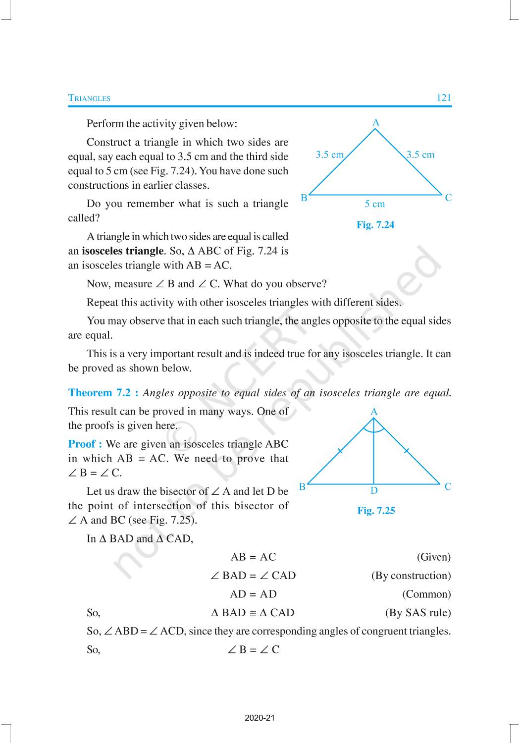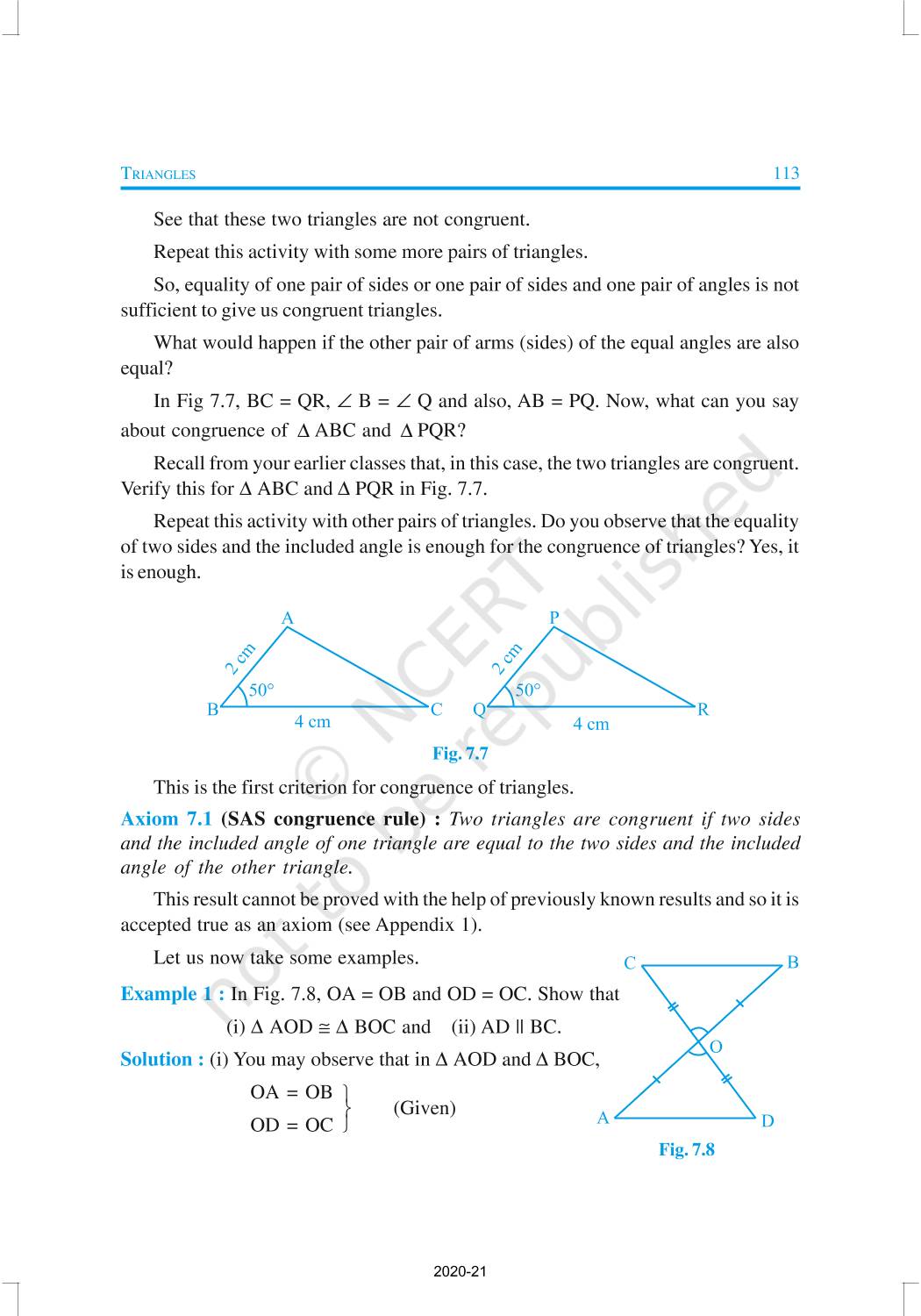 You have studied about triangles and their various properties in your earlier classes. You know that a closed figure formed by three intersecting lines is called a triangle. (‘Tri’ means ‘three’). A triangle has three sides, three angles and three vertices. In Chapter 6, you have also studied some properties of triangles. In this chapter, you will study in details about the congruence of triangles, rules of congruence, some more properties of triangles and inequalities in a triangle. You have already verified most of these properties in earlier classes. We will now prove some of them.