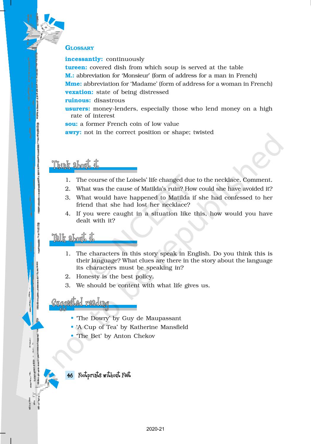 BeTrained.in has brought the NCERT books for class 10 Footprints Without Feet where you can find every topic explained in a detailed way. These books are recommended by CBSE and some other state boards. Most of the teachers also use these books for teaching in schools. It is also used as a reference to prepare the questions for mid-term and final exams. The topics are explained in a very easy language along with examples and diagrams. Also, ideal for comprehensive and thorough learning to develop a clear concept. The chapters in the books have illustrative examples and practice problems for getting a hold of any kind of concept.