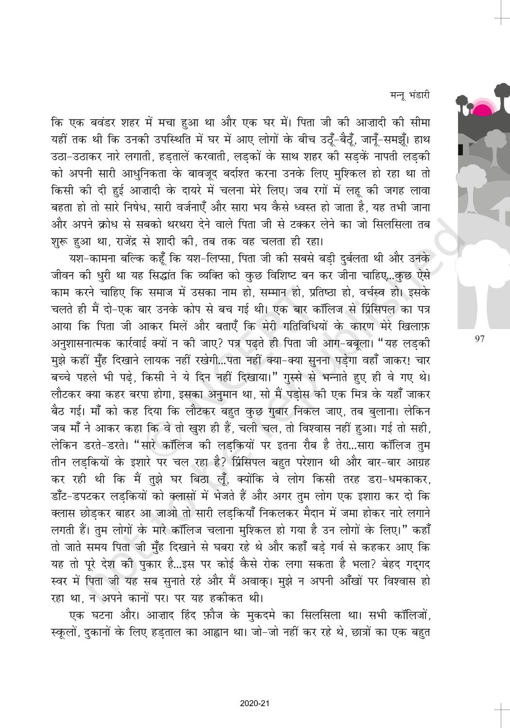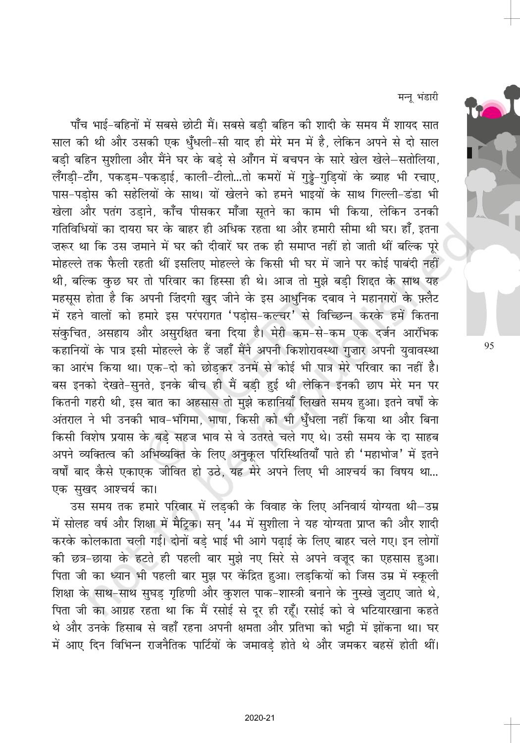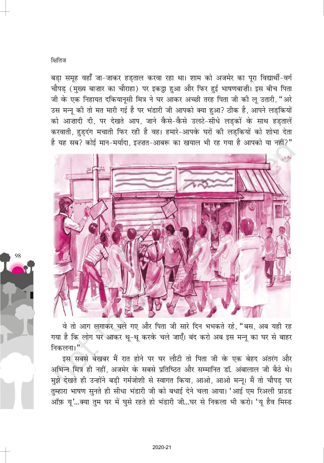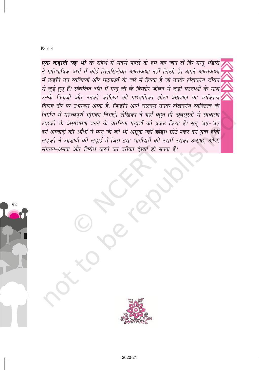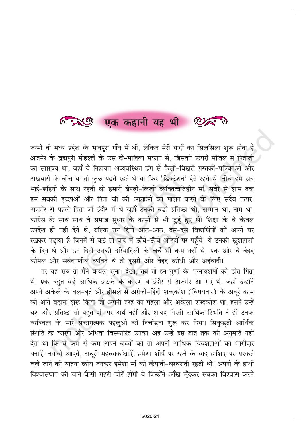 The time when students had limited options of choice for NCERT books wherein they need to go to the bookstore to buy the books but here at BeTrained.in, you can read the complete chapter-Mannu Bhandari of NCERT books for class 10 Hindi Kshitij Part 2. If CBSE class 10 students are finding it hard to search for NCERT Hindi Kshitij Part 2 books online, then this is the right place as we have provided the textbooks of NCERT chapter wise. These books are available on our website for free along with NCERT Solutions and Exemplar solutions.