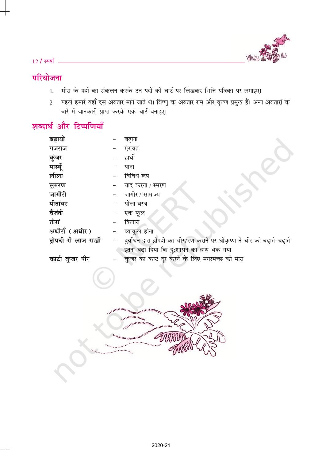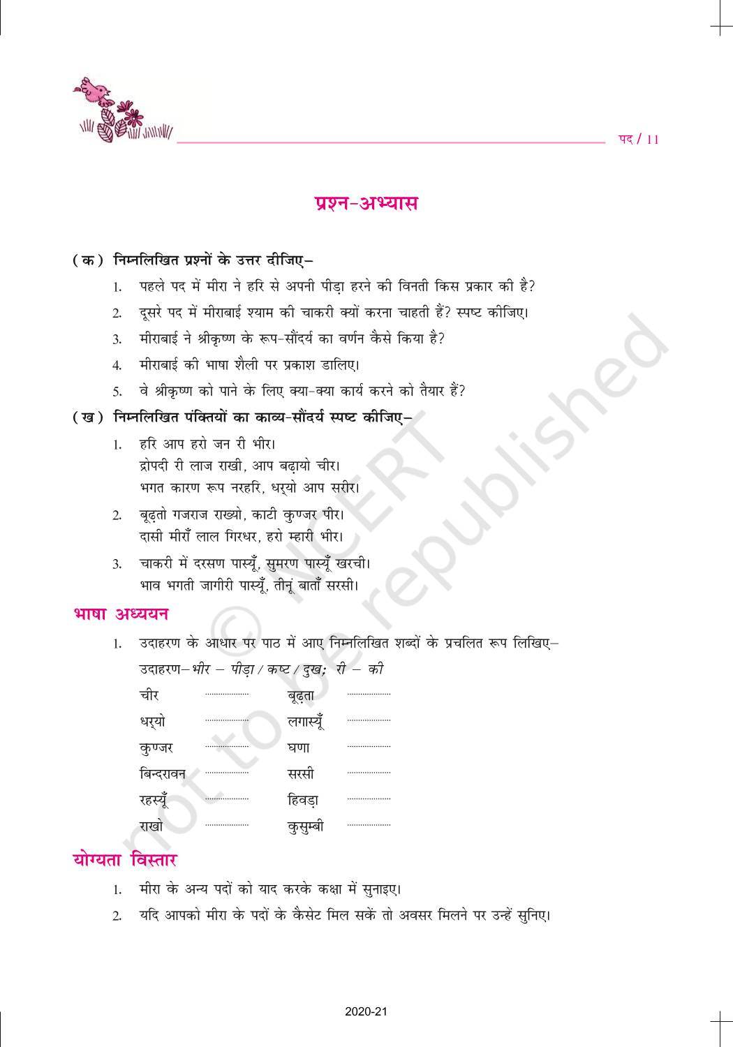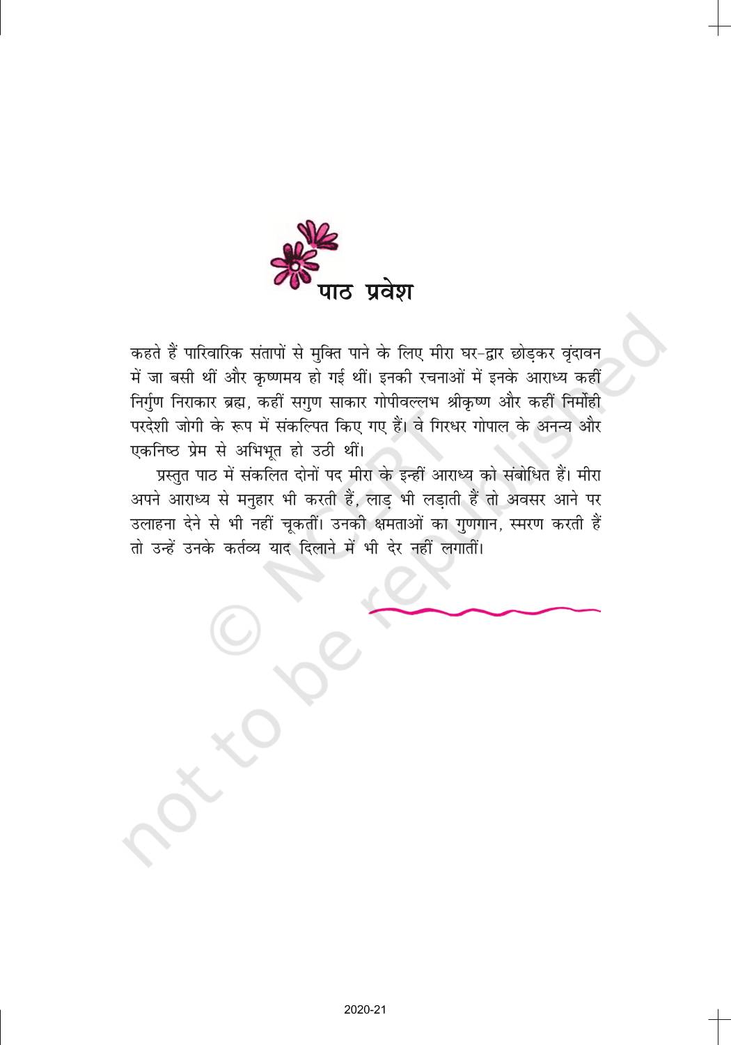 The time when students had limited options of choice for NCERT books wherein they need to go to the bookstore to buy the books but here at BeTrained.in, you can read the complete chapter-Meera Padd of NCERT books for class 10 Hindi Sparsh Part 2. If CBSE class 10 students are finding it hard to search for NCERT Hindi Sparsh Part 2 books online, then this is the right place as we have provided the textbooks of NCERT chapter wise. These books are available on our website for free along with NCERT Solutions and Exemplar solutions.