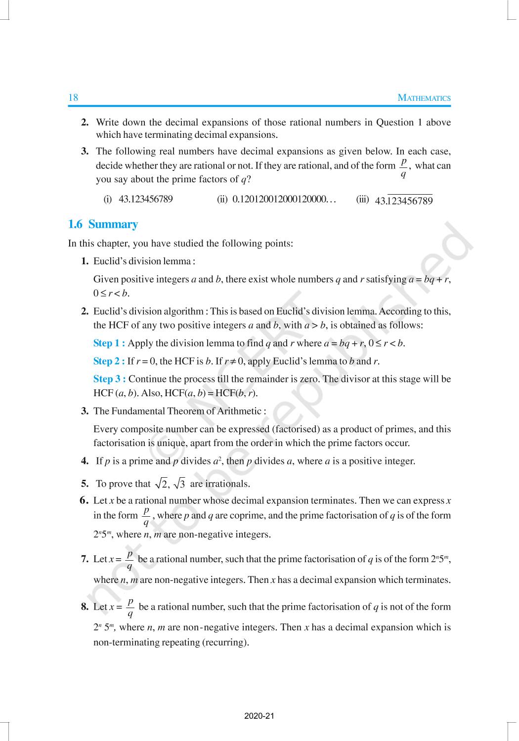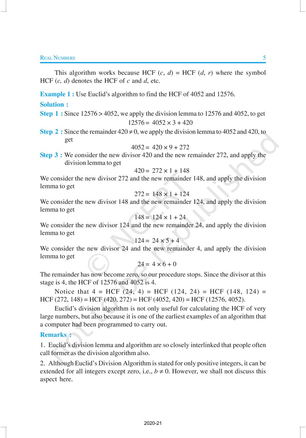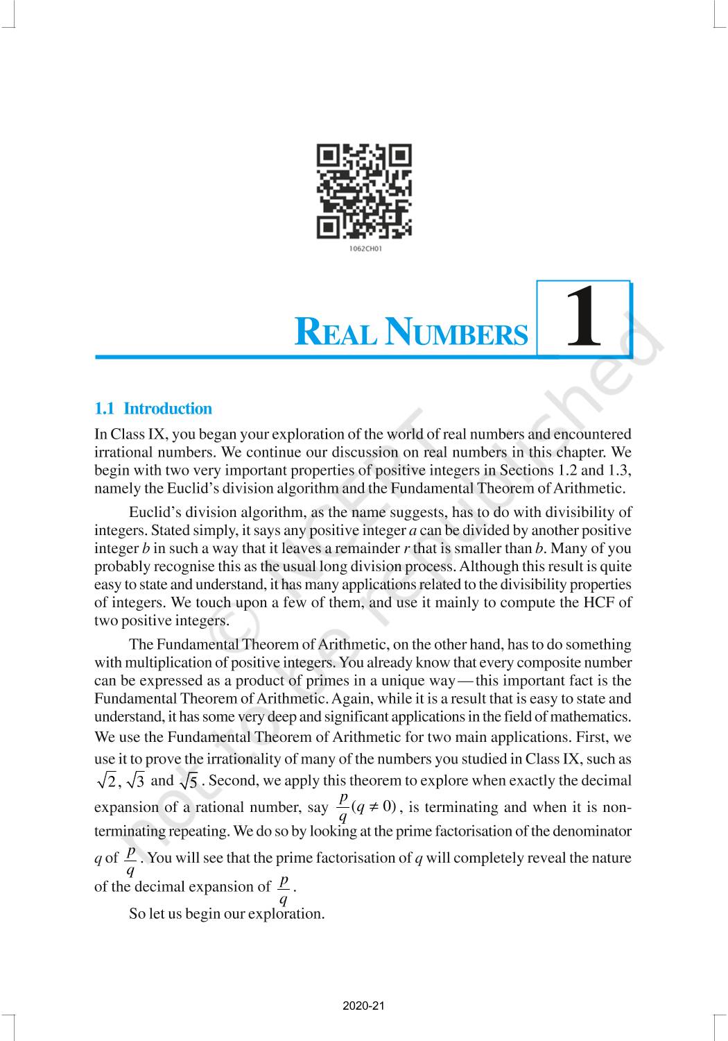 In Previous Class, you began your exploration of the world of real numbers and encountered irrational numbers. We continue our discussion on real numbers in this chapter. We begin with two very important properties of positive integers in Sections 1.2 and 1.3, namely the Euclid's division algorithm and the Fundamental Theorem of Arithmetic. Euclid's division algorithm, as the name suggests, has to do with divisibility of integers. Stated simply, it says any positive integer a can be divided by another positive integer b in such a way that it leaves a remainder r that is smaller than b. Many of you probably recognise this as the usual long division process. Although this result is quite easy to state and understand, it has many applications related to the divisibility properties of integers. We touch upon a few of them, and use it mainly to compute the HCF of two positive integers.