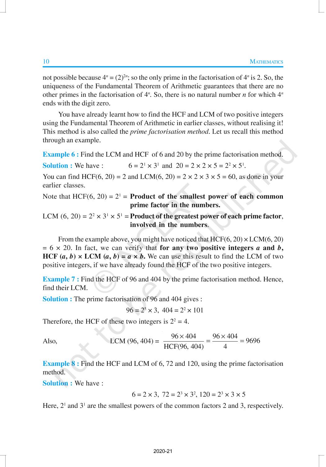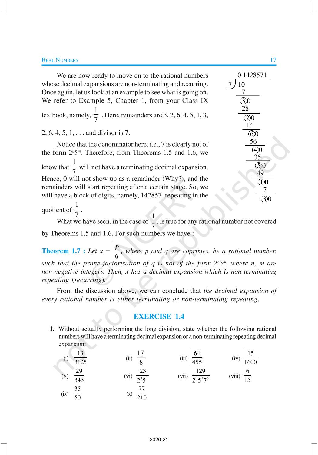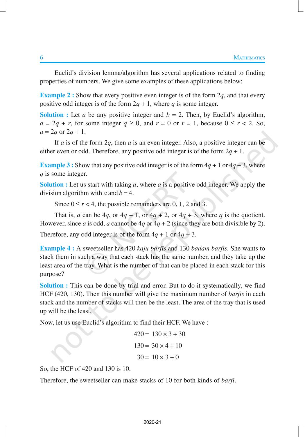 In Previous Class, you began your exploration of the world of real numbers and encountered irrational numbers. We continue our discussion on real numbers in this chapter. We begin with two very important properties of positive integers in Sections 1.2 and 1.3, namely the Euclid's division algorithm and the Fundamental Theorem of Arithmetic. Euclid's division algorithm, as the name suggests, has to do with divisibility of integers. Stated simply, it says any positive integer a can be divided by another positive integer b in such a way that it leaves a remainder r that is smaller than b. Many of you probably recognise this as the usual long division process. Although this result is quite easy to state and understand, it has many applications related to the divisibility properties of integers. We touch upon a few of them, and use it mainly to compute the HCF of two positive integers.