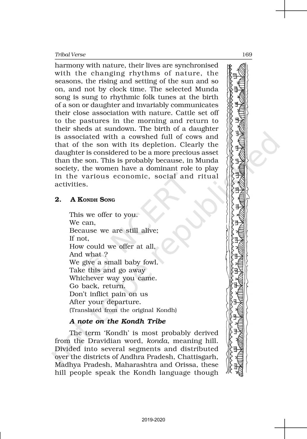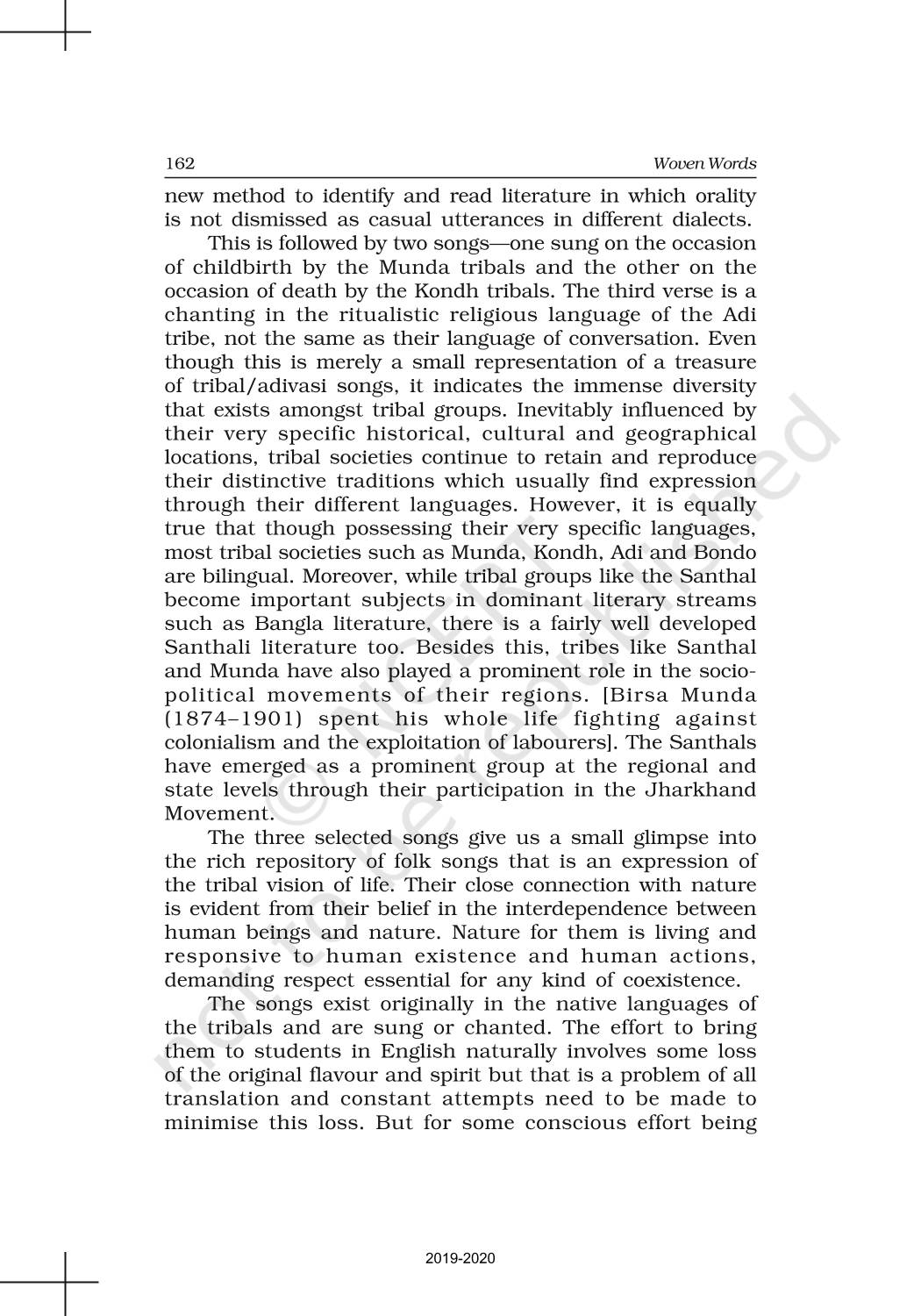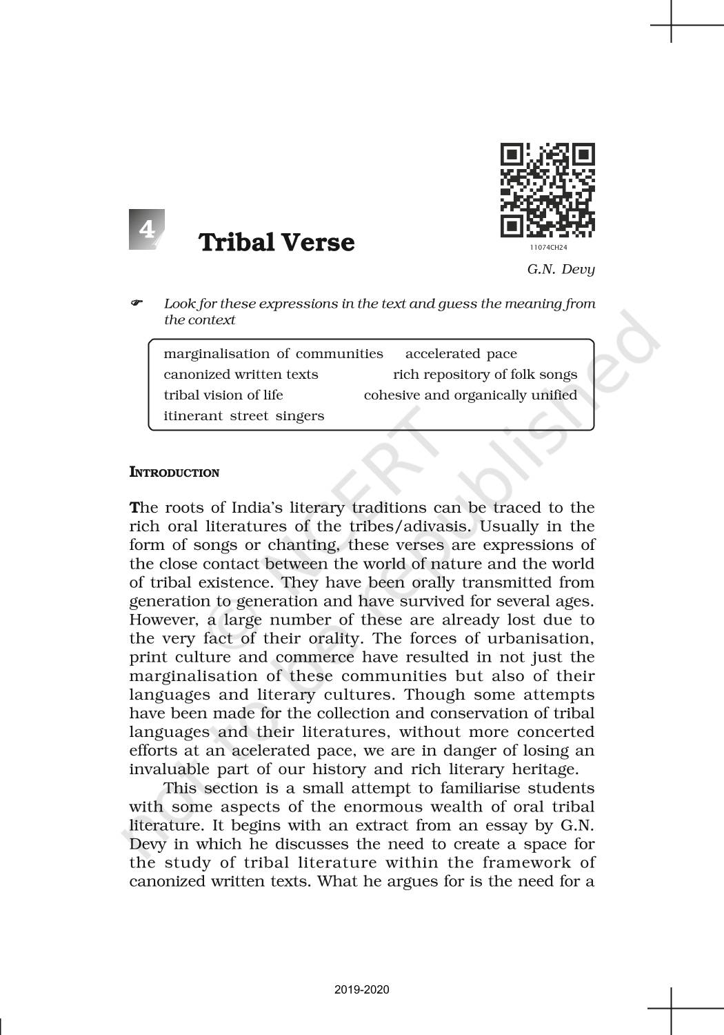 The time when students had limited options of choice for NCERT books wherein they need to go to the bookstore to buy the books but here at BeTrained.in, you can read the complete chapter-Essays 4 Tribal Verse of NCERT books for class 11 English Woven Words. If CBSE class 11 students are finding it hard to search for NCERT English Woven Words books online, then this is the right place as we have provided the textbooks of NCERT chapter wise. These books are available on our website for free along with NCERT Solutions and Exemplar solutions.
