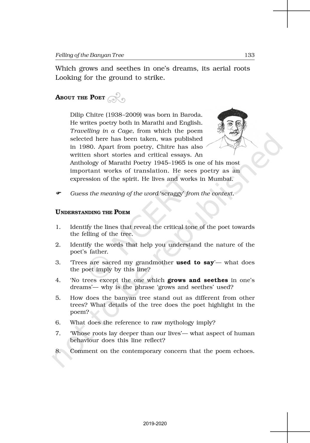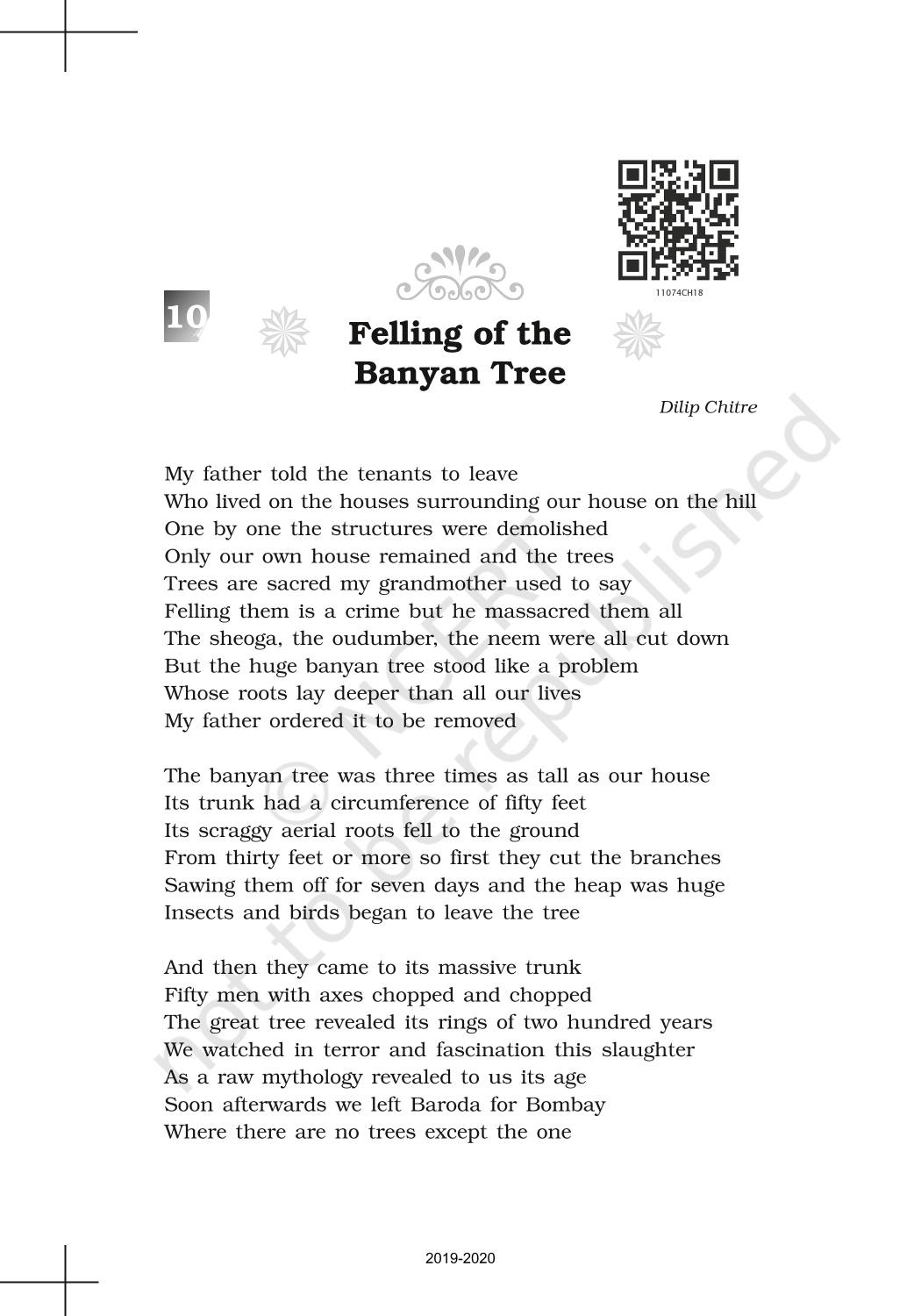 The time when students had limited options of choice for NCERT books wherein they need to go to the bookstore to buy the books but here at BeTrained.in, you can read the complete chapter-Poetry 10 Felling Of The Banyan Tree of NCERT books for class 11 English Woven Words. If CBSE class 11 students are finding it hard to search for NCERT English Woven Words books online, then this is the right place as we have provided the textbooks of NCERT chapter wise. These books are available on our website for free along with NCERT Solutions and Exemplar solutions.