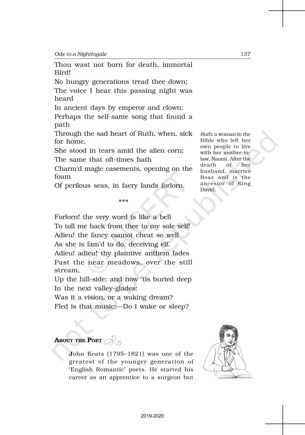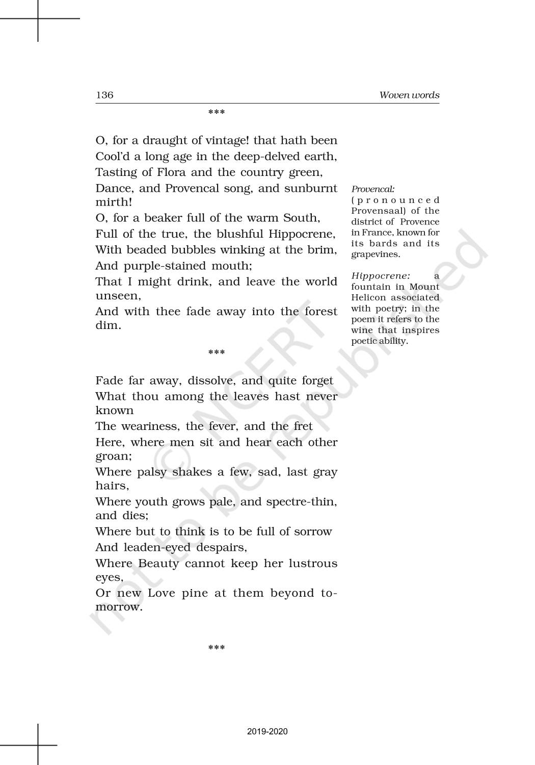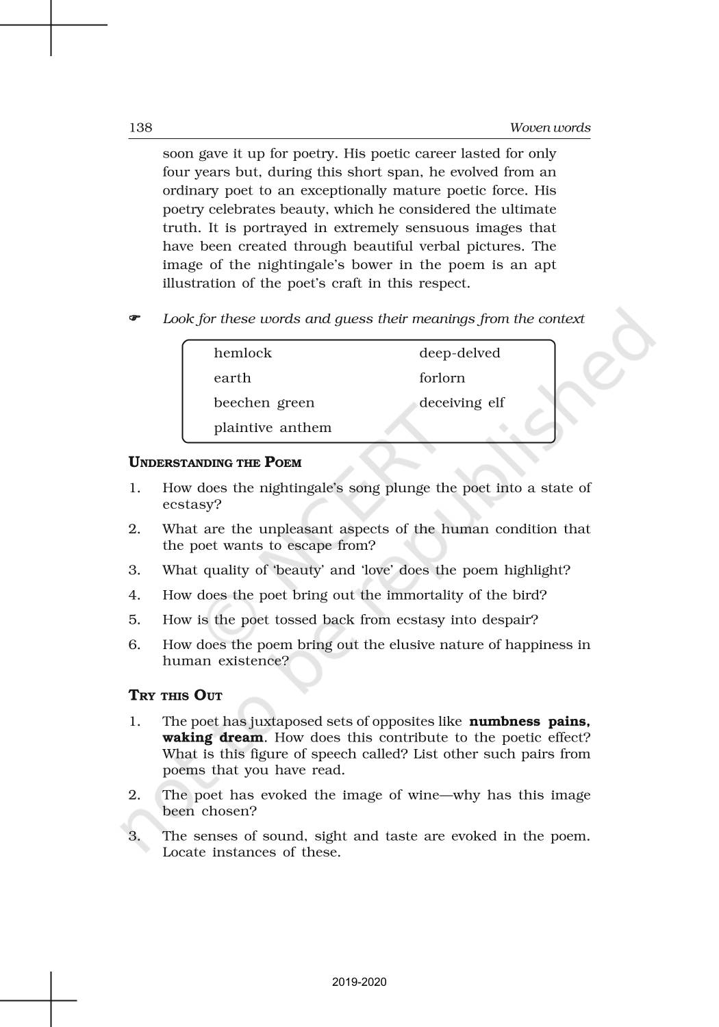 The time when students had limited options of choice for NCERT books wherein they need to go to the bookstore to buy the books but here at BeTrained.in, you can read the complete chapter-Poetry 11 Ode To A Nightingale of NCERT books for class 11 English Woven Words. If CBSE class 11 students are finding it hard to search for NCERT English Woven Words books online, then this is the right place as we have provided the textbooks of NCERT chapter wise. These books are available on our website for free along with NCERT Solutions and Exemplar solutions.