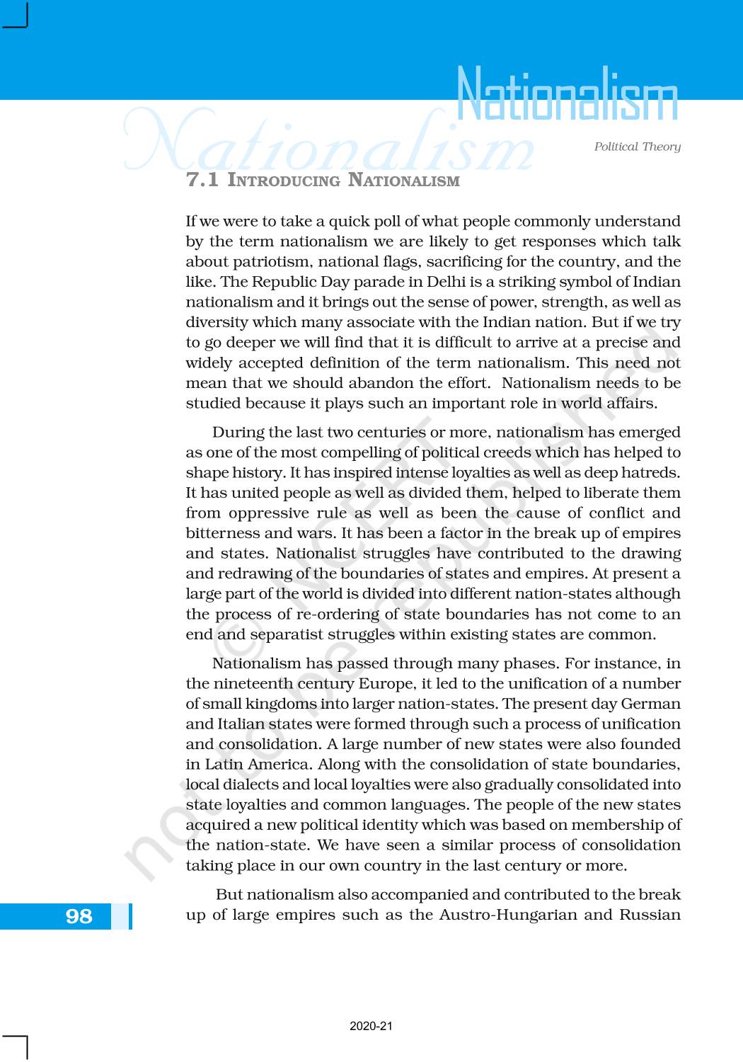The time when students had limited options of choice for NCERT books wherein they need to go to the bookstore to buy the books but here at BeTrained.in, you can read the complete chapter-Nationalism of NCERT books for class 11 Political Theory. If CBSE class 11 students are finding it hard to search for NCERT Political Theory books online, then this is the right place as we have provided the textbooks of NCERT chapter wise. These books are available on our website for free along with NCERT Solutions and Exemplar solutions.