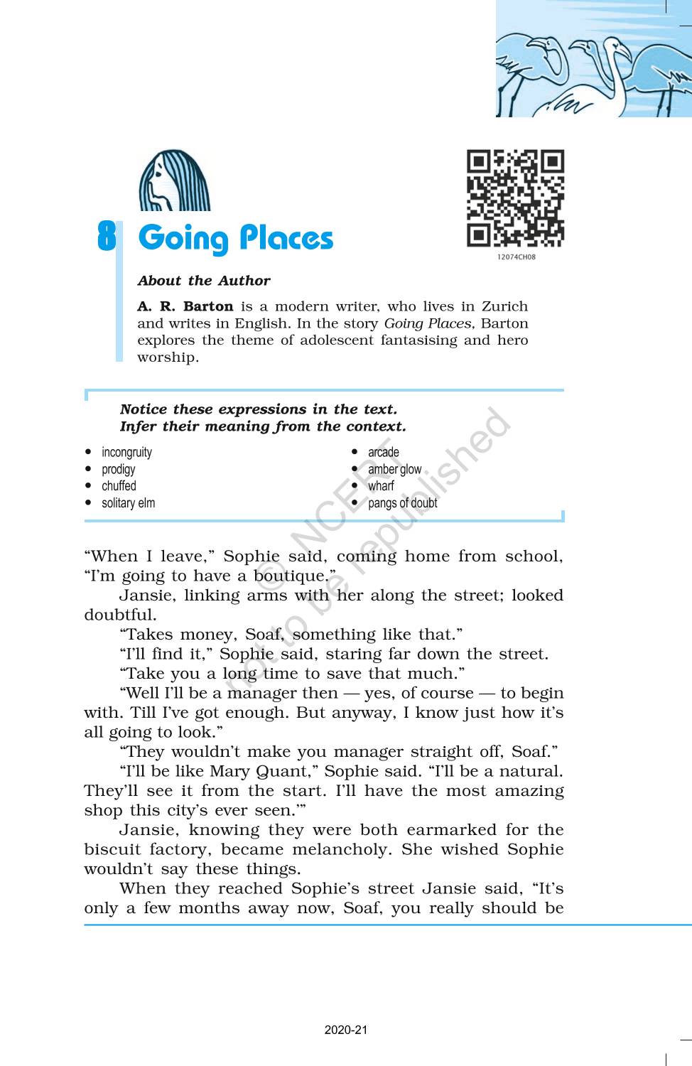 The time when students had limited options of choice for NCERT books wherein they need to go to the bookstore to buy the books but here at BeTrained.in, you can read the complete chapter-Prose 8 Going Places of NCERT books for class 12 Flamingo. If CBSE class 12 students are finding it hard to search for NCERT Flamingo books online, then this is the right place as we have provided the textbooks of NCERT chapter wise. These books are available on our website for free along with NCERT Solutions and Exemplar solutions.