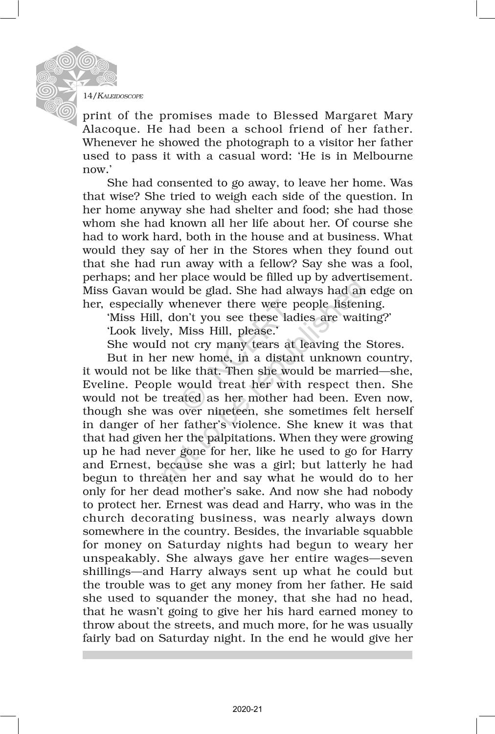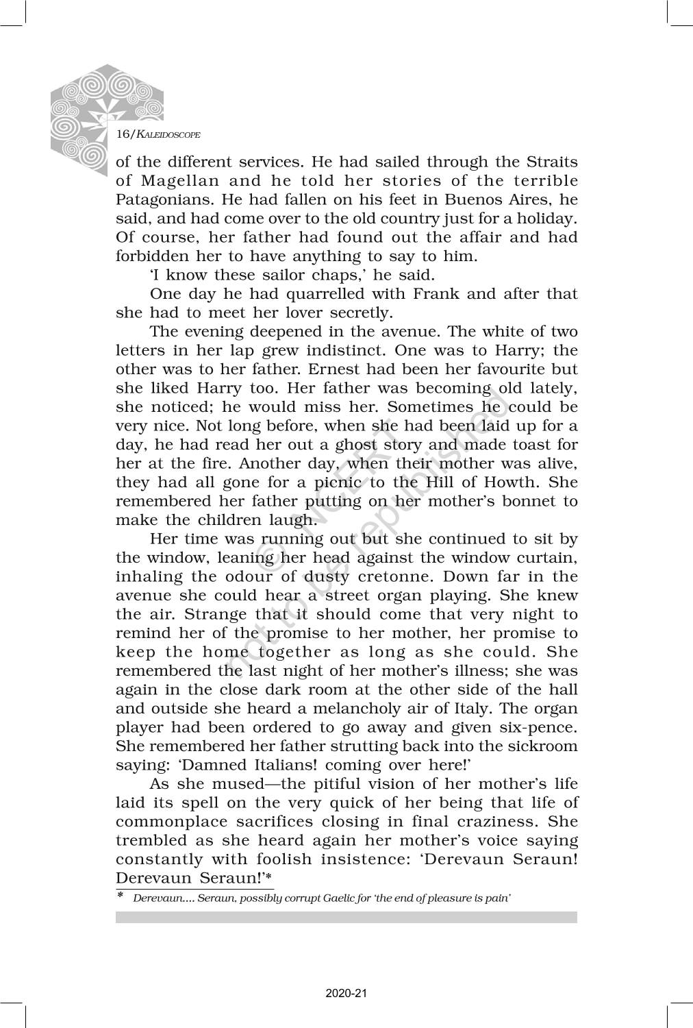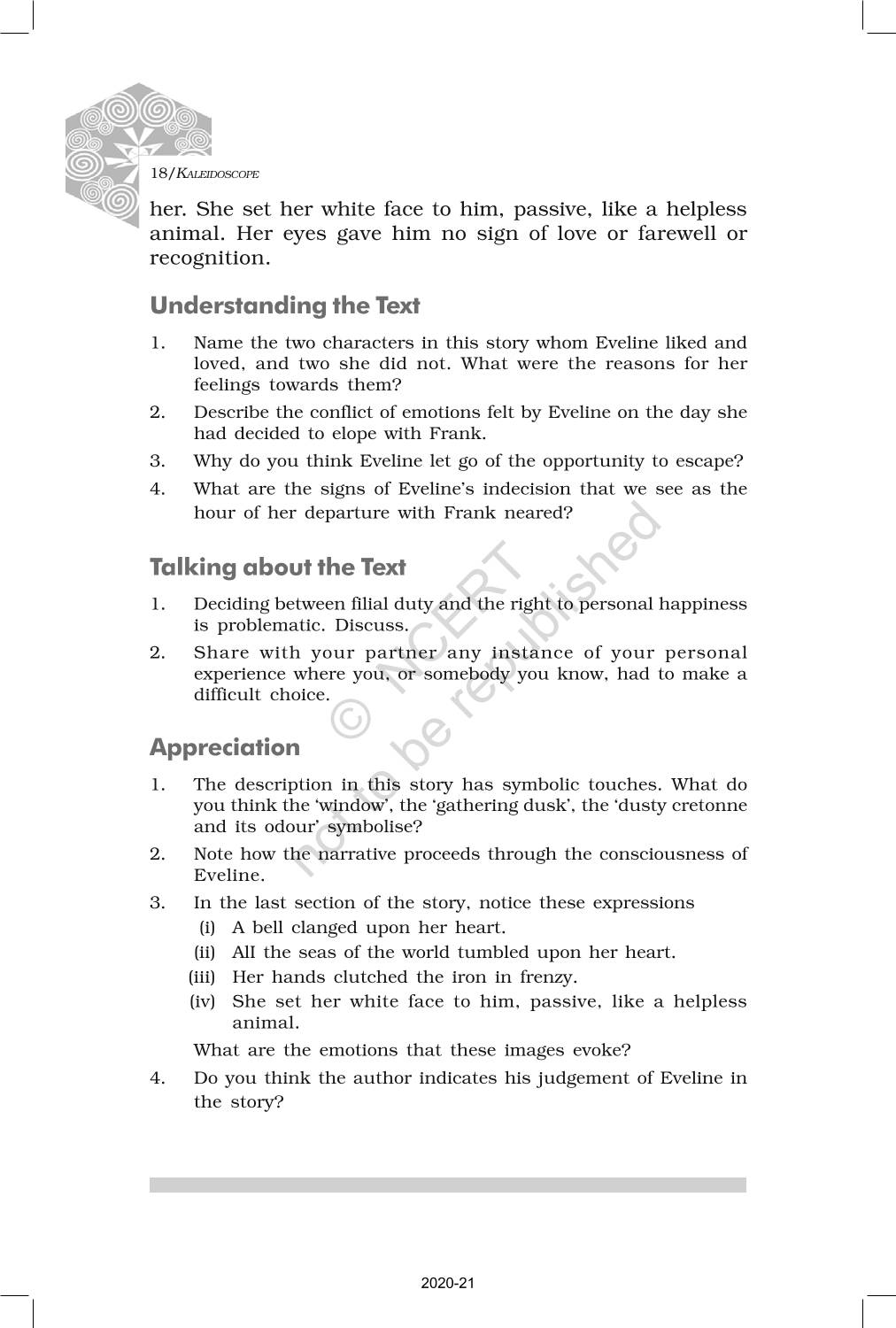 The time when students had limited options of choice for NCERT books wherein they need to go to the bookstore to buy the books but here at BeTrained.in, you can read the complete chapter-Short Stories 2 Eveline of NCERT books for class 12 Kaleidoscope. If CBSE class 12 students are finding it hard to search for NCERT Kaleidoscope books online, then this is the right place as we have provided the textbooks of NCERT chapter wise. These books are available on our website for free along with NCERT Solutions and Exemplar solutions.