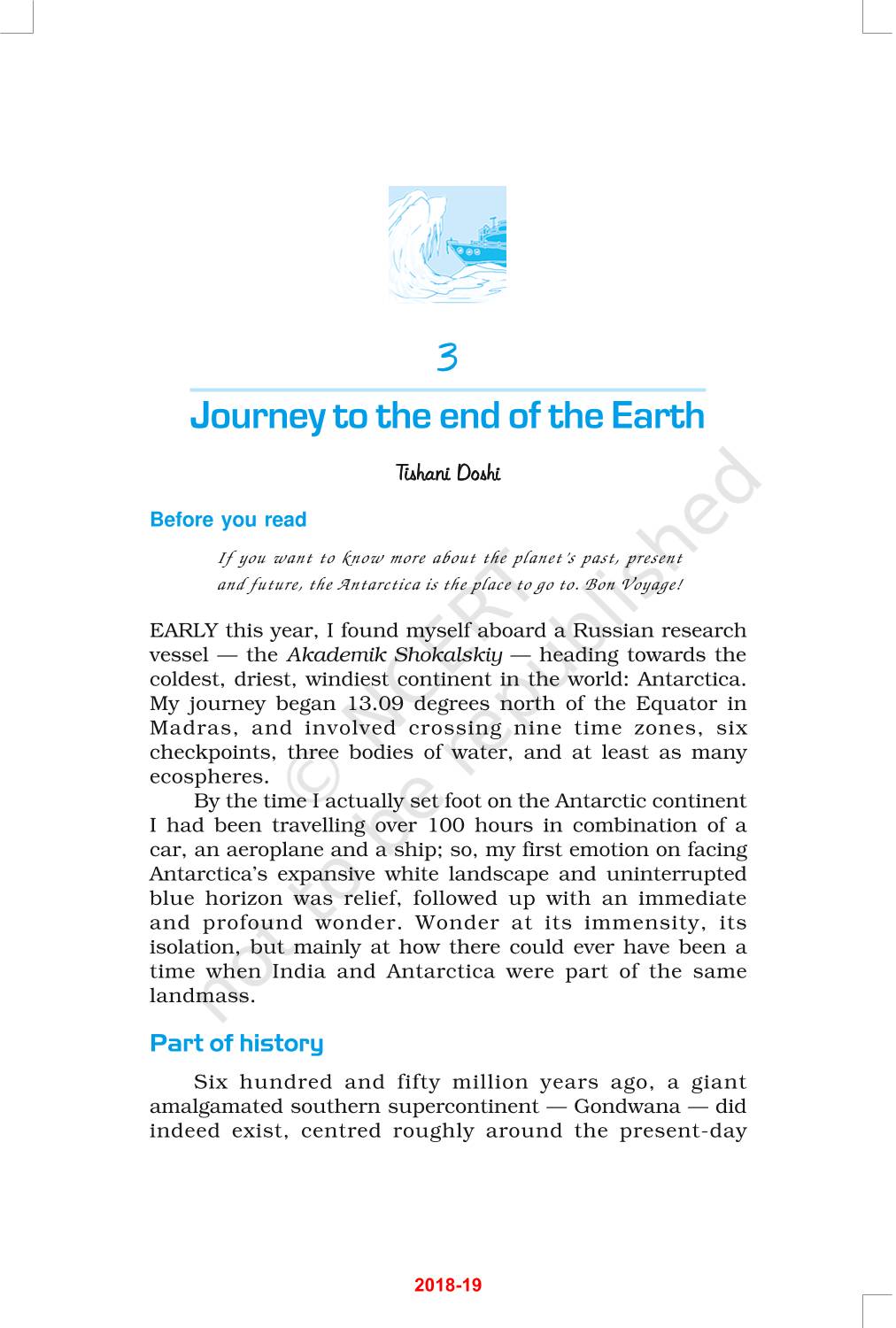 The time when students had limited options of choice for NCERT books wherein they need to go to the bookstore to buy the books but here at BeTrained.in, you can read the complete chapter-Journey To The End Of The Earth of NCERT books for class 12 Vistas. If CBSE class 12 students are finding it hard to search for NCERT Vistas books online, then this is the right place as we have provided the textbooks of NCERT chapter wise. These books are available on our website for free along with NCERT Solutions and Exemplar solutions.