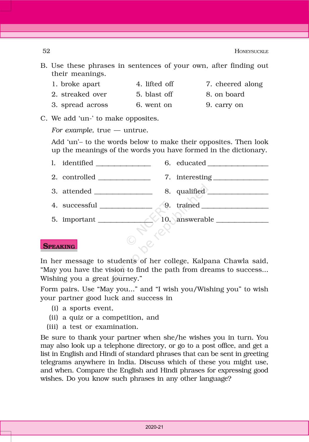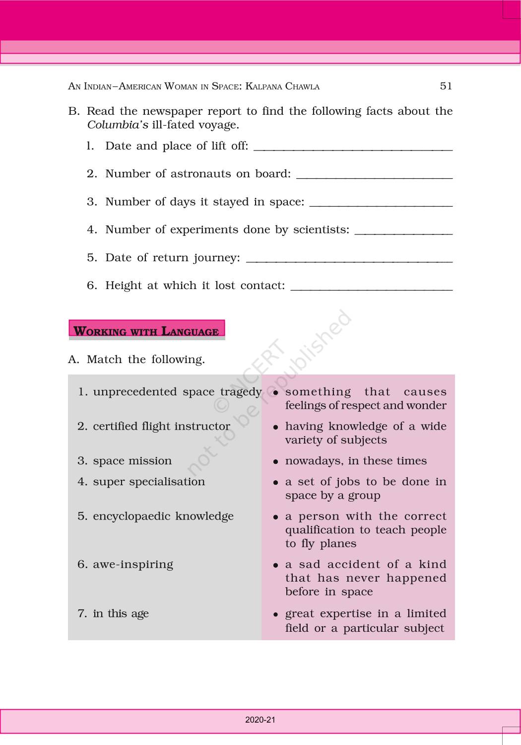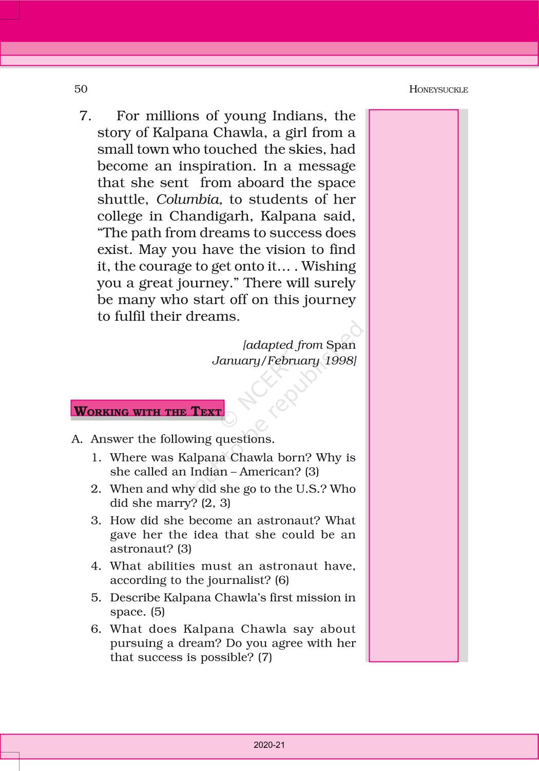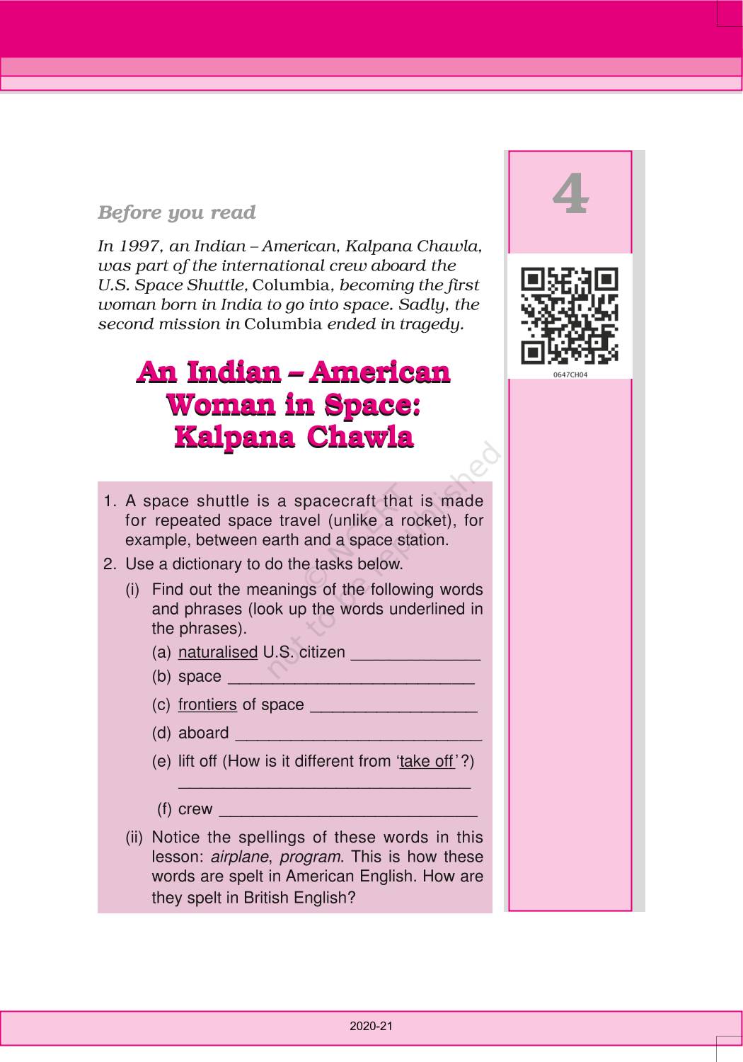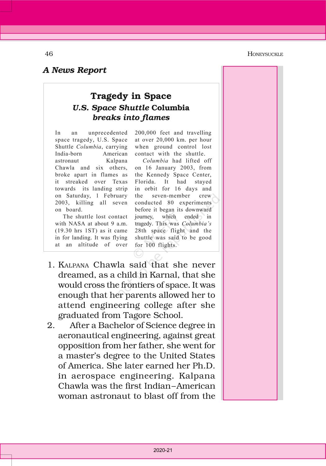 The time when students had limited options of choice for NCERT books wherein they need to go to the bookstore to buy the books but here at BeTrained.in, you can read the complete chapter-An Indian American Woman In Space Kalpana Chawla of NCERT books for class 6 English Honeysuckle. If CBSE class 6 students are finding it hard to search for NCERT English Honeysuckle books online, then this is the right place as we have provided the textbooks of NCERT chapter wise. These books are available on our website for free along with NCERT Solutions and Exemplar solutions.
