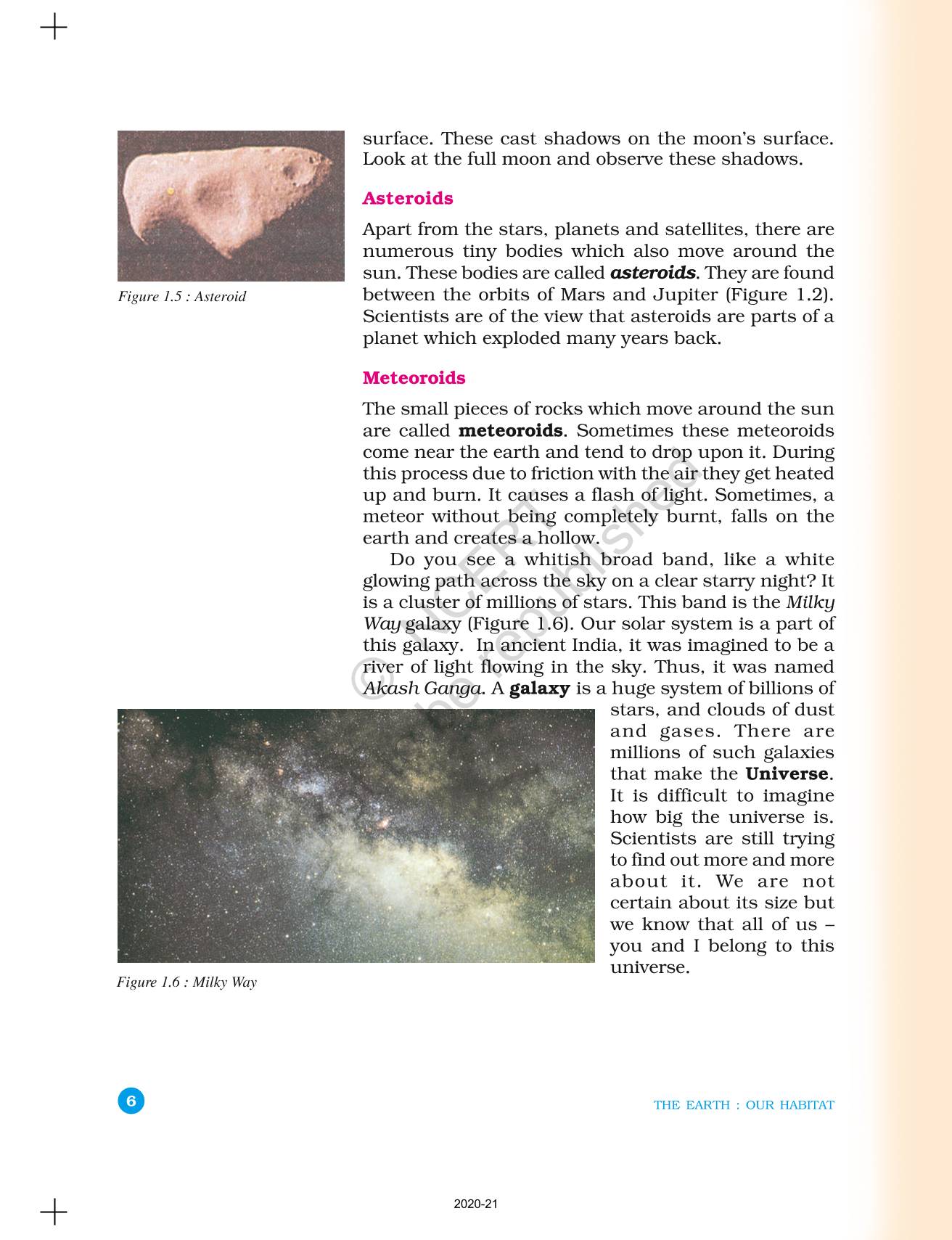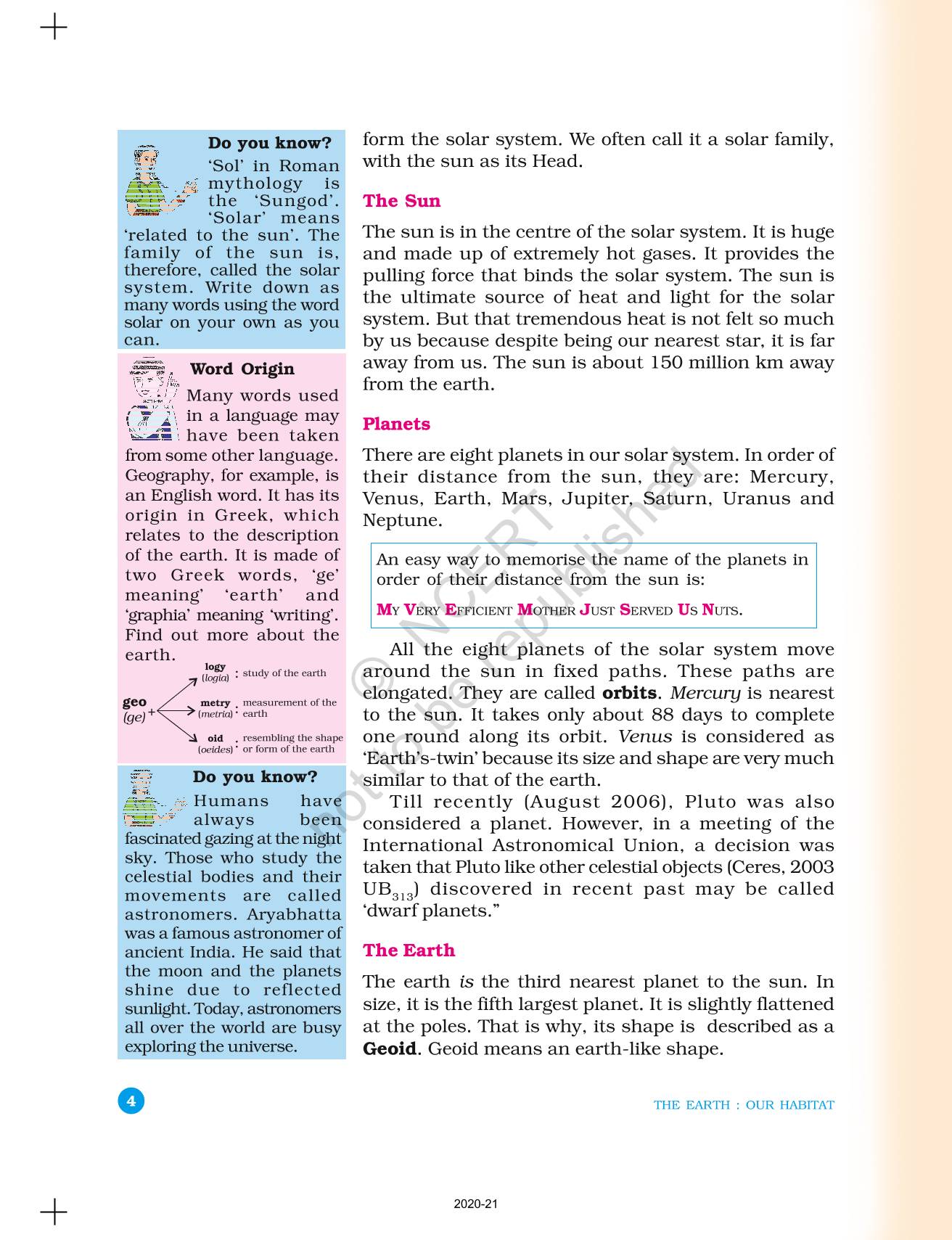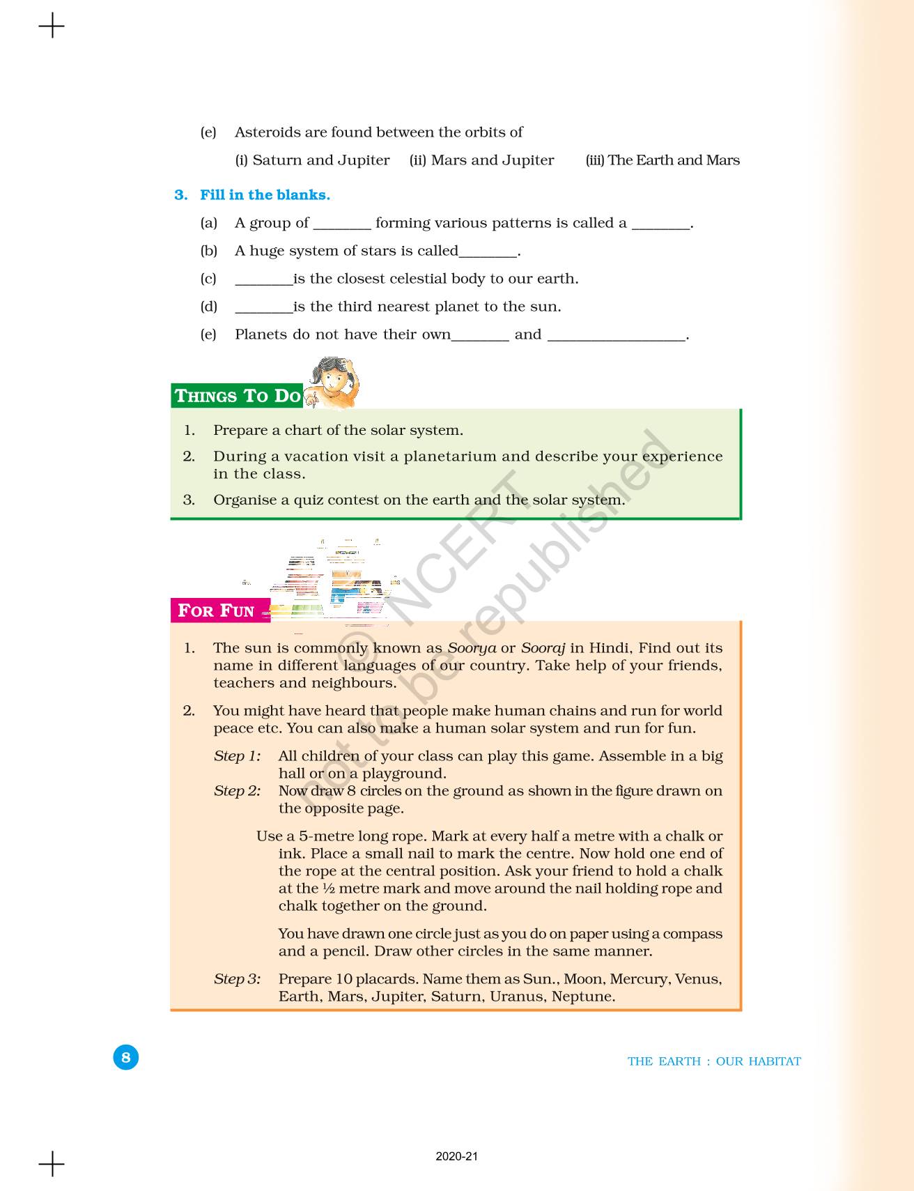 The time when students had limited options of choice for NCERT books wherein they need to go to the bookstore to buy the books but here at BeTrained.in, you can read the complete chapter-The Earth In The Solar System of NCERT books for class 6 Geography The Earth Our Habitat. If CBSE class 6 students are finding it hard to search for NCERT Geography The Earth Our Habitat books online, then this is the right place as we have provided the textbooks of NCERT chapter wise. These books are available on our website for free along with NCERT Solutions and Exemplar solutions.