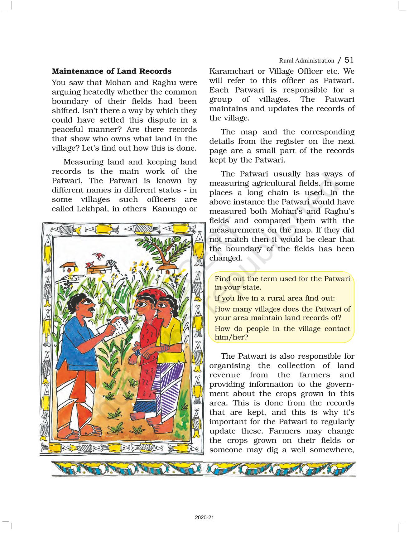 The time when students had limited options of choice for NCERT books wherein they need to go to the bookstore to buy the books but here at BeTrained.in, you can read the complete chapter-Rural Administration of NCERT books for class 6 Political Science Social And Political Life I. If CBSE class 6 students are finding it hard to search for NCERT Political Science Social And Political Life I books online, then this is the right place as we have provided the textbooks of NCERT chapter wise. These books are available on our website for free along with NCERT Solutions and Exemplar solutions.