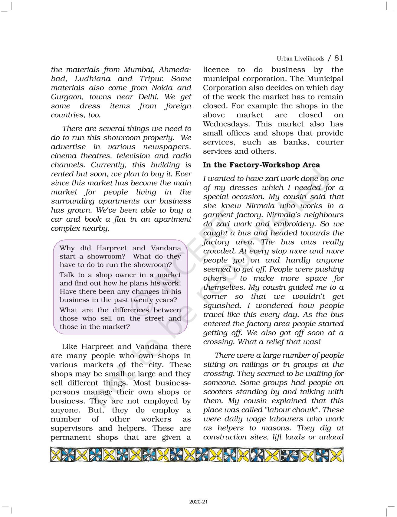 The time when students had limited options of choice for NCERT books wherein they need to go to the bookstore to buy the books but here at BeTrained.in, you can read the complete chapter-Urban Livelihoods of NCERT books for class 6 Political Science Social And Political Life I. If CBSE class 6 students are finding it hard to search for NCERT Political Science Social And Political Life I books online, then this is the right place as we have provided the textbooks of NCERT chapter wise. These books are available on our website for free along with NCERT Solutions and Exemplar solutions.