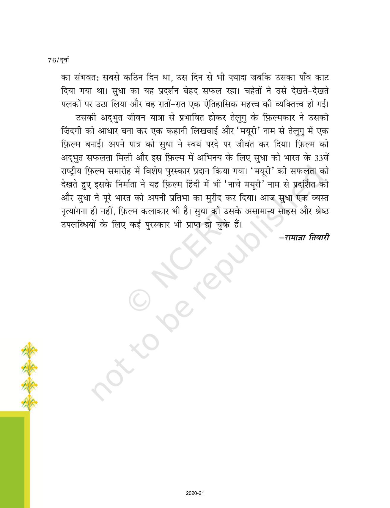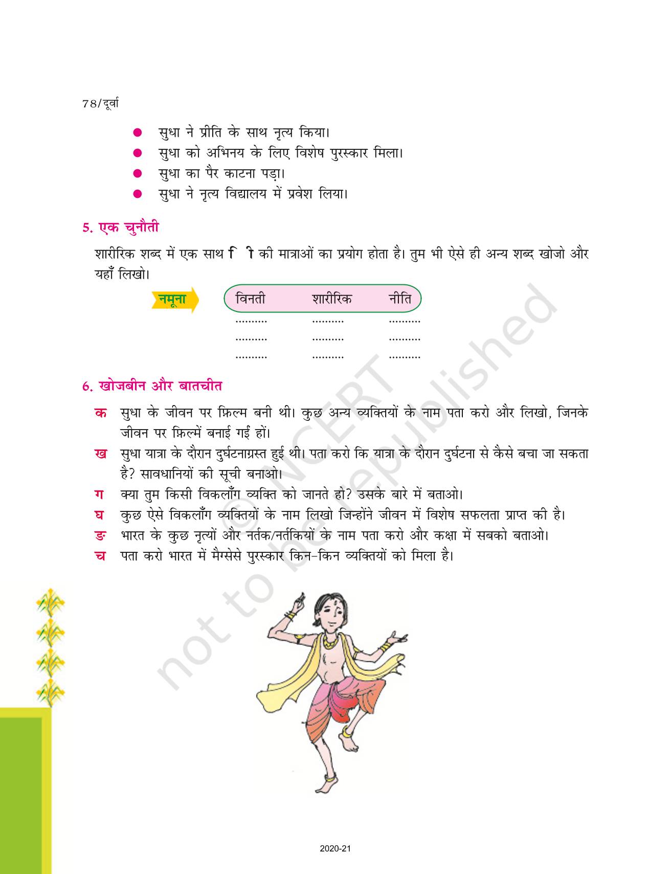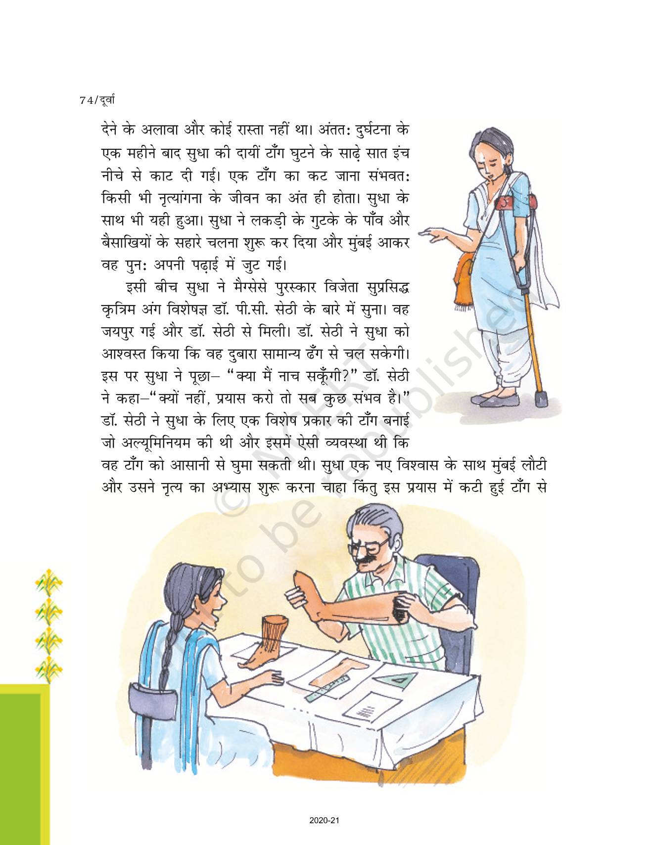 The time when students had limited options of choice for NCERT books wherein they need to go to the bookstore to buy the books but here at BeTrained.in, you can read the complete chapter-Nrityangana Sudha Chandran of NCERT books for class 7 Hindi Durva Part 2. If CBSE class 7 students are finding it hard to search for NCERT Hindi Durva Part 2 books online, then this is the right place as we have provided the textbooks of NCERT chapter wise. These books are available on our website for free along with NCERT Solutions and Exemplar solutions.