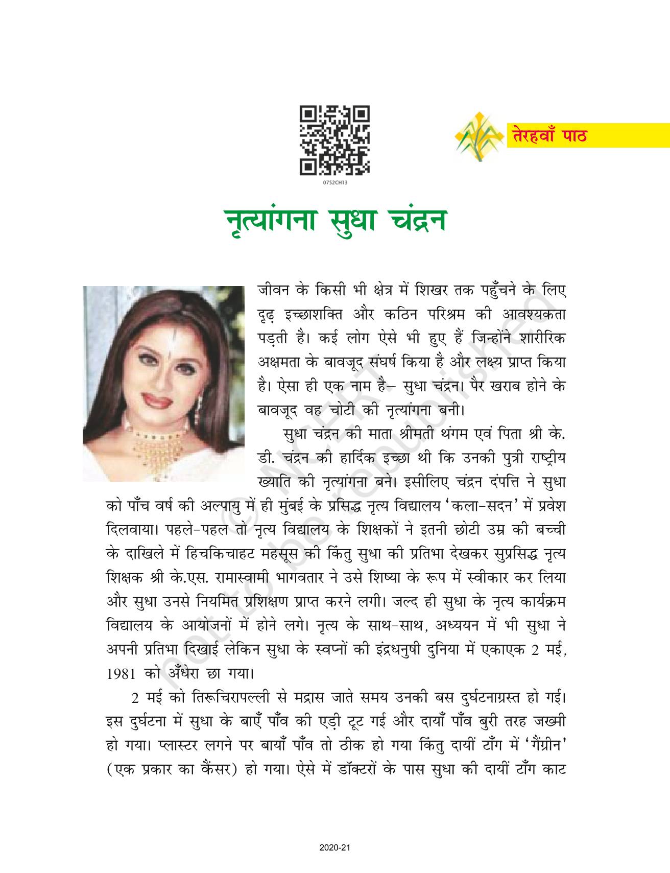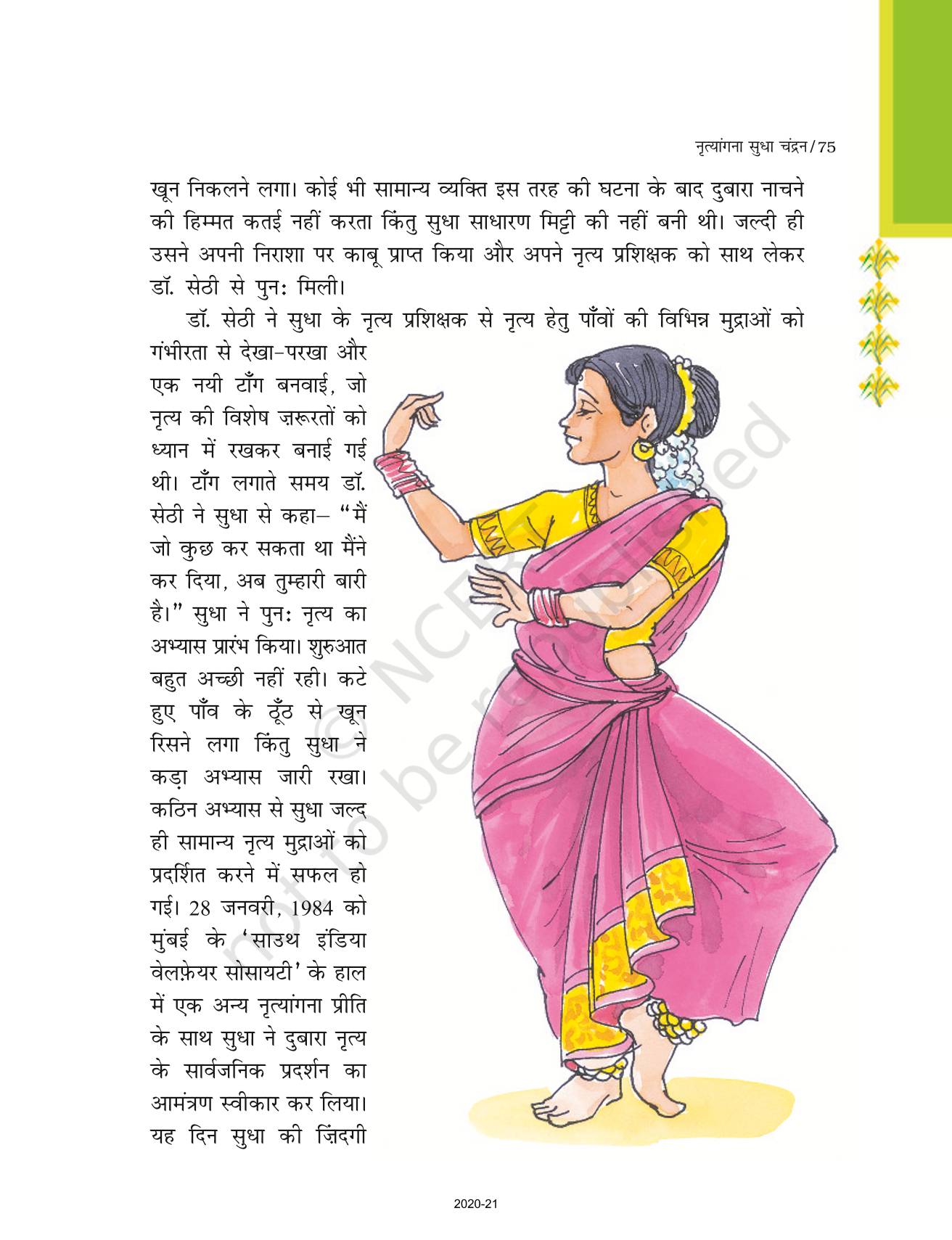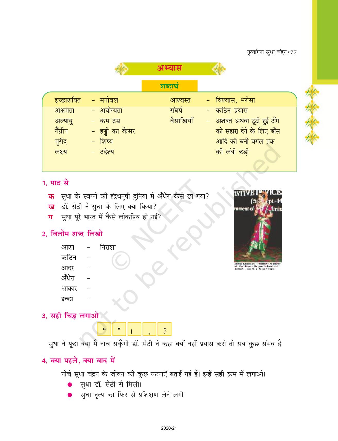The time when students had limited options of choice for NCERT books wherein they need to go to the bookstore to buy the books but here at BeTrained.in, you can read the complete chapter-Nrityangana Sudha Chandran of NCERT books for class 7 Hindi Durva Part 2. If CBSE class 7 students are finding it hard to search for NCERT Hindi Durva Part 2 books online, then this is the right place as we have provided the textbooks of NCERT chapter wise. These books are available on our website for free along with NCERT Solutions and Exemplar solutions.