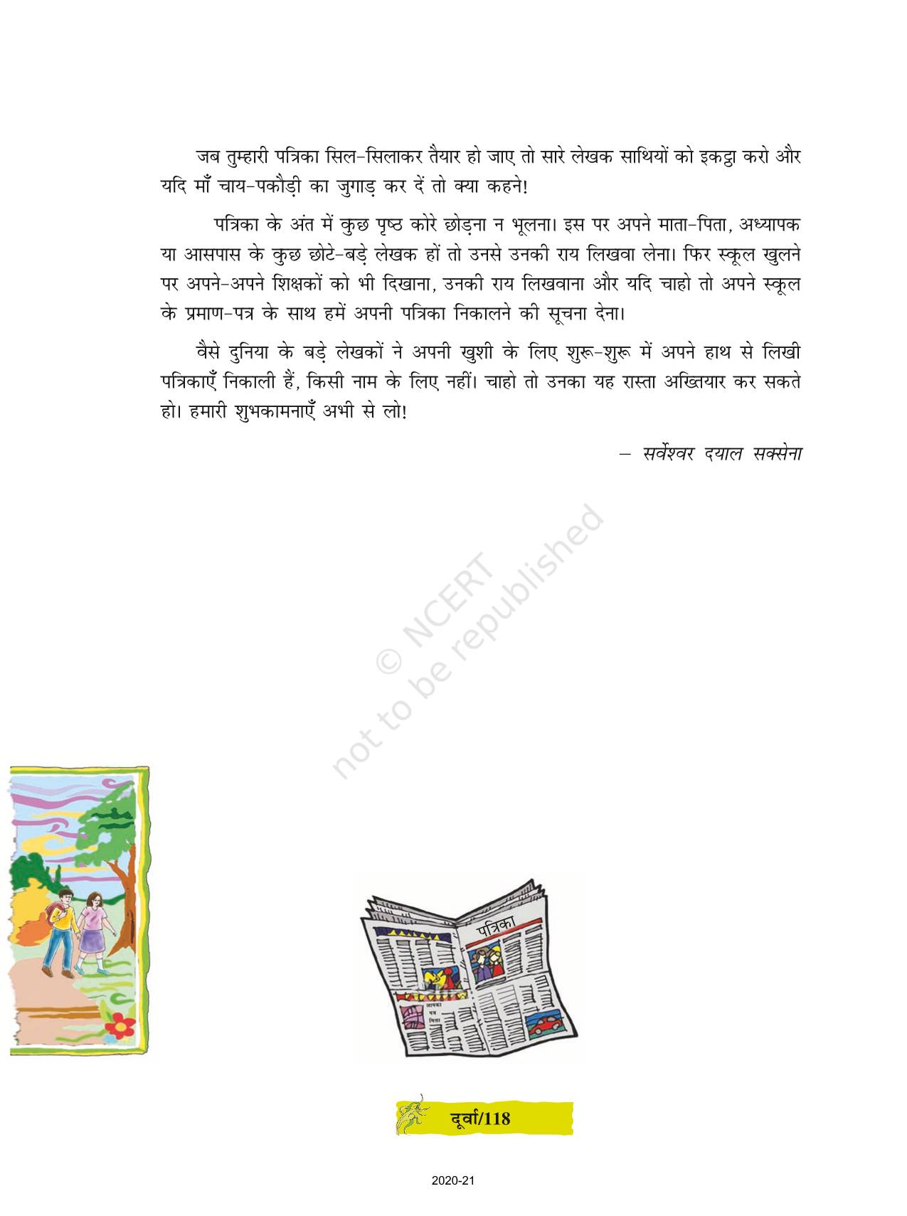 The time when students had limited options of choice for NCERT books wherein they need to go to the bookstore to buy the books but here at BeTrained.in, you can read the complete chapter-Aao Patrika Nikale of NCERT books for class 8 Hindi Durva Part 3. If CBSE class 8 students are finding it hard to search for NCERT Hindi Durva Part 3 books online, then this is the right place as we have provided the textbooks of NCERT chapter wise. These books are available on our website for free along with NCERT Solutions and Exemplar solutions.