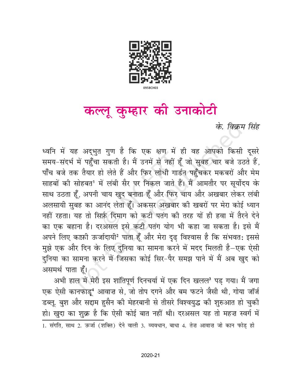 The time when students had limited options of choice for NCERT books wherein they need to go to the bookstore to buy the books but here at BeTrained.in, you can read the complete chapter-Kallu Kumhaar Ki Unnkoti of NCERT books for class 9 Hindi Sanchayan Part 1. If CBSE class 9 students are finding it hard to search for NCERT Hindi Sanchayan Part 1 books online, then this is the right place as we have provided the textbooks of NCERT chapter wise. These books are available on our website for free along with NCERT Solutions and Exemplar solutions.
